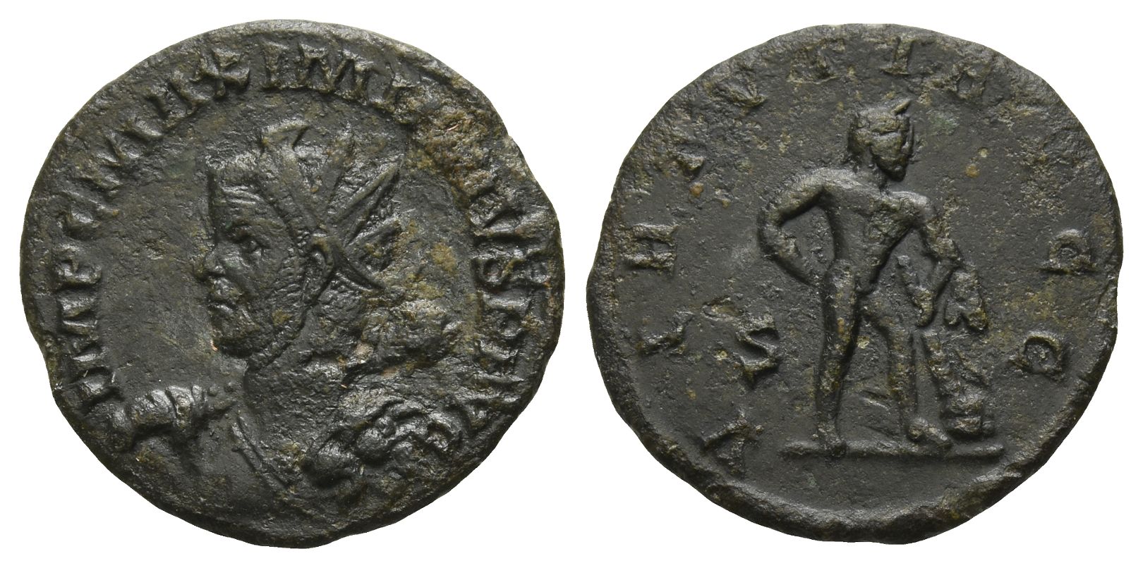 Lugdunum mint; struck AD 289. 2nd officina. IMP C MAXIMIANVS P AVG, radiate and cuirassed bust to left, in the guise of Hercules, holding club over his right shoulder and wearing lion skin over his left / VIRTVTI AVGG, Hercules standing to right, leaning on club with lion's skin on rock; S in left field. RIC V.2 465. 2.58gr, 20mm, 1h