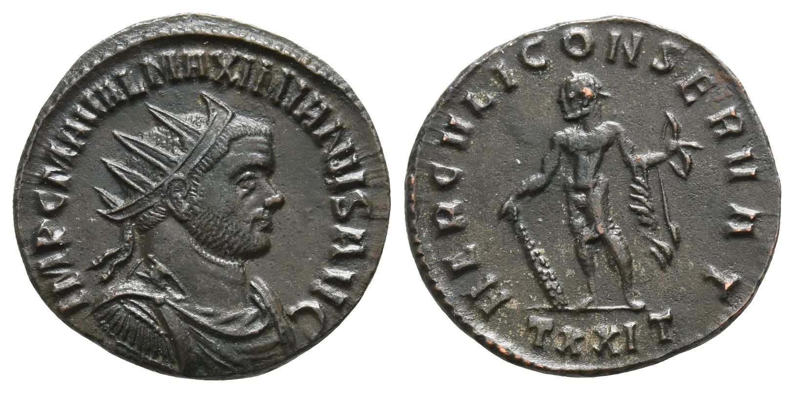 Ticinum mint; struck AD 290. IMP C M A VAL MAXIMIANVS AVG, radiate, draped and cuirassed bust to right / HERCVLI CONSERVAT, Hercules standing to left, nude, right hand on club, left holding lion skin and bow; TXXIT in exergue. RIC V 548. 3.65gr, 22mm, 12h.