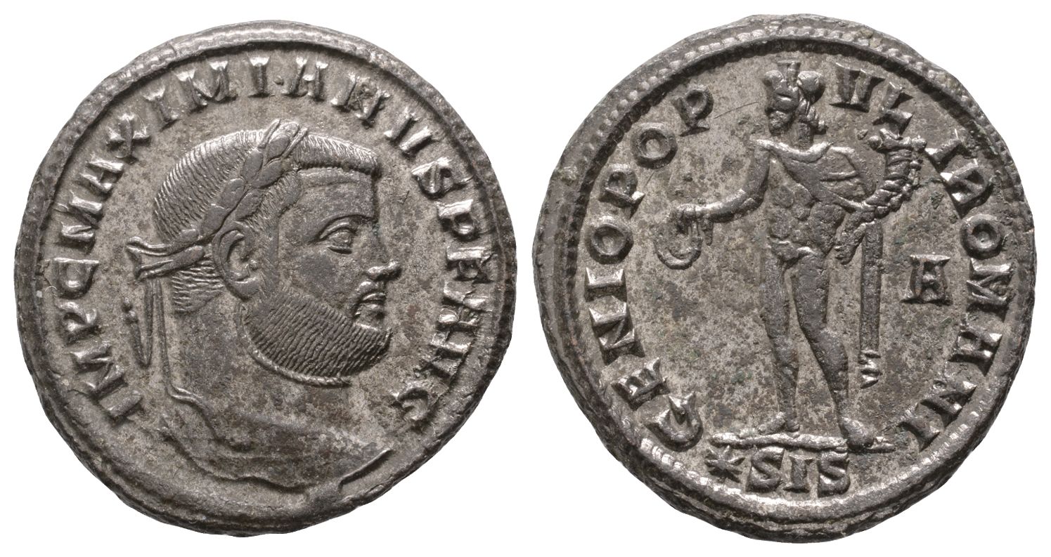 Siscia mint; struck AD 295. 1st officina. IMP C MAXIMIANVS P F AVG, laureate head to right / GENIO POP-VLI ROMANI, Genius standing facing, head to left, modius on head, naked except for chlamys over left shoulder, holding patera with right hand and cornucopia with left; A in right field, (star)SIS in exergue. RIC VI 85b. 9.65gr, 28mm, 11h