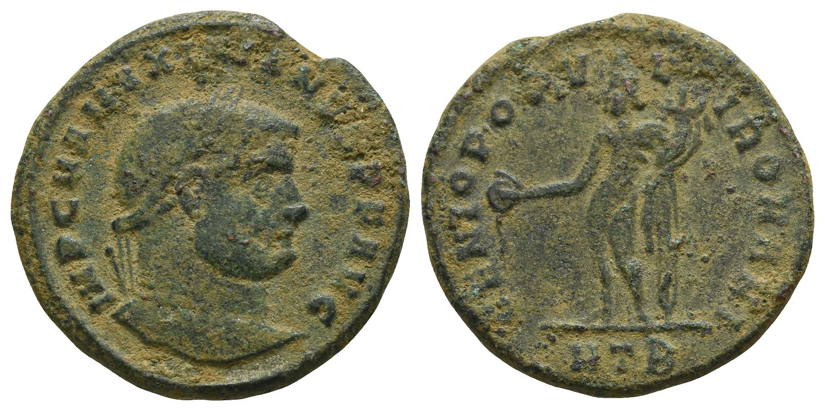 2nd officina. IMP C M A MAXIMIANVS P F AVG, laureate head to right / GENIO POPVLI ROMANI, Genius, wearing modius on head, standing to left, holding cornucopia and patera from which liquor flows; HTB in exergue. RIC VI 19b corr. (obv. legend). 9.95gr, 28mm, 11h.