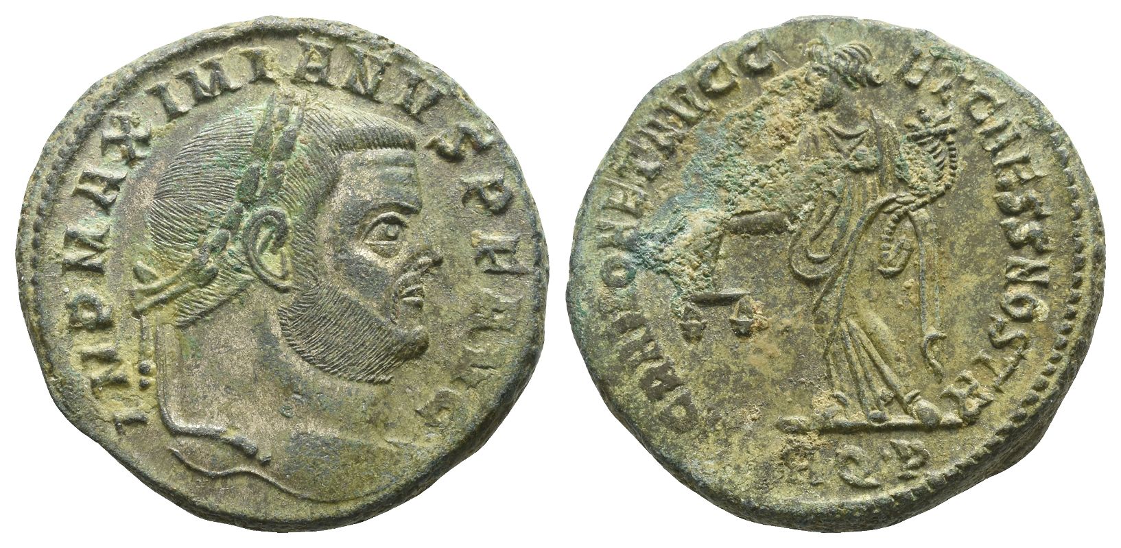 IMP MAXIMIANVS P F AVG, laureate head to right / SACRA MONET AVGG ET CAESS NOSTR, Moneta standing to left, holding scales and cornucopiae; AQP (or AQ•P?) in exergue. Unpublished with this mintmark or RIC VI 29b. 9.83gr, 25mm, 12h.