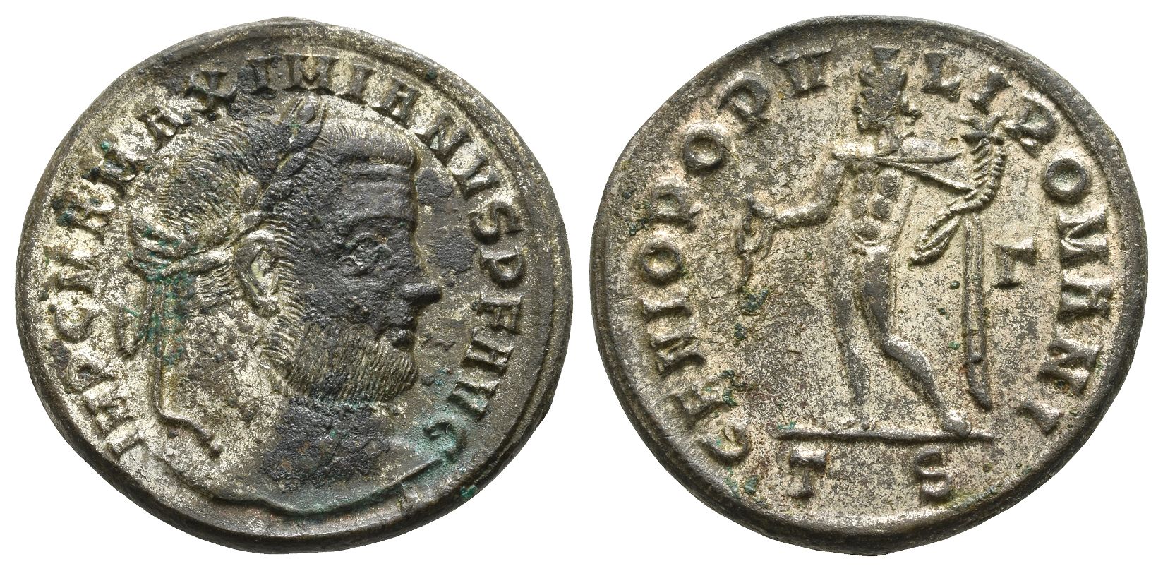 IMP C MA MAXIMIANVS P F AVG, laureate head to right / GENIO POPVLI ROMANI, Genius, wearing modius on head, standing to left, holding cornucopia and patera, from which liquid flows; Γ in right field, TS in exergue. RIC VI 23b. 10.03gr, 28mm, 6h.