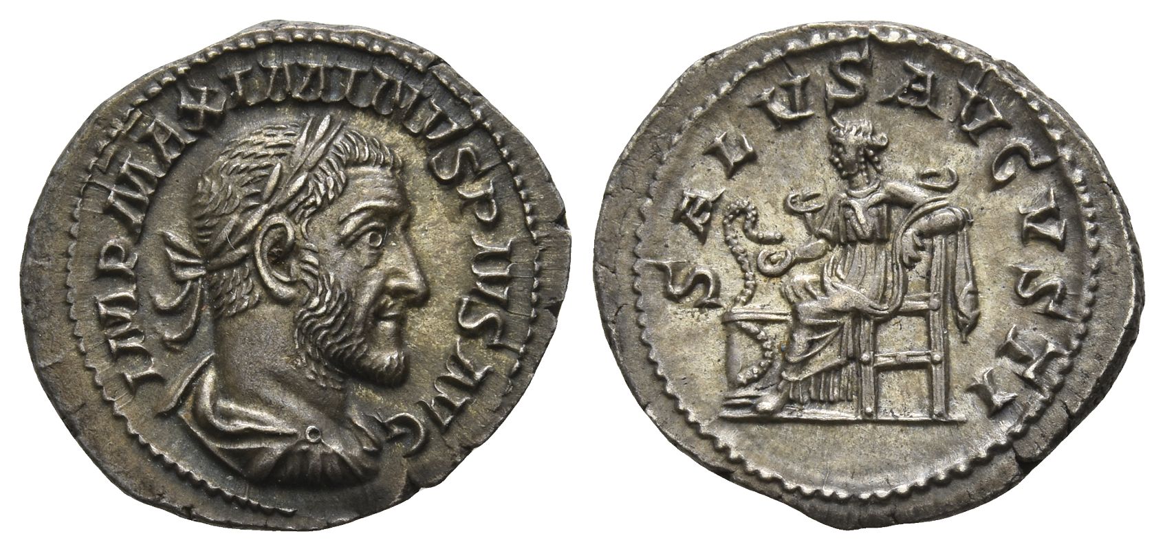 Rome mint; struck AD 235-236. IMP MAXIMINVS PIVS AVG, laureate, draped and cuirassed bust to right, seen from rear / SALVS AVGVSTI, Salus seated to left, feeding out of patera snake coiled around altar before. RIC IV 14; BMCRE 99; RSC 85a. 3.25gr, 21mm, 6h