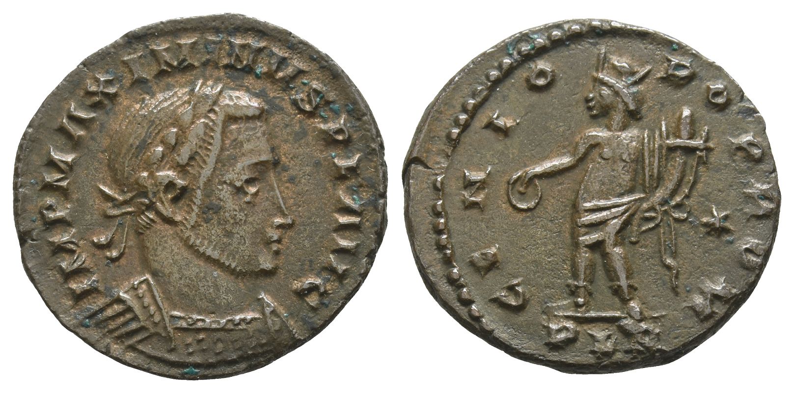 London mint; struck AD 311-312. 1st officina. IMP MAXIMINVS P F AVG, laureate and cuirassed bust to right / GENIO POP ROM, Genius standing facing, head to left, wearing modius, holding patera and cornucopia; star in right field, PLN in exergue. RIC VI 209b; C&T 7.05.011; RML 413. 3.81gr, 21mm, 7h.