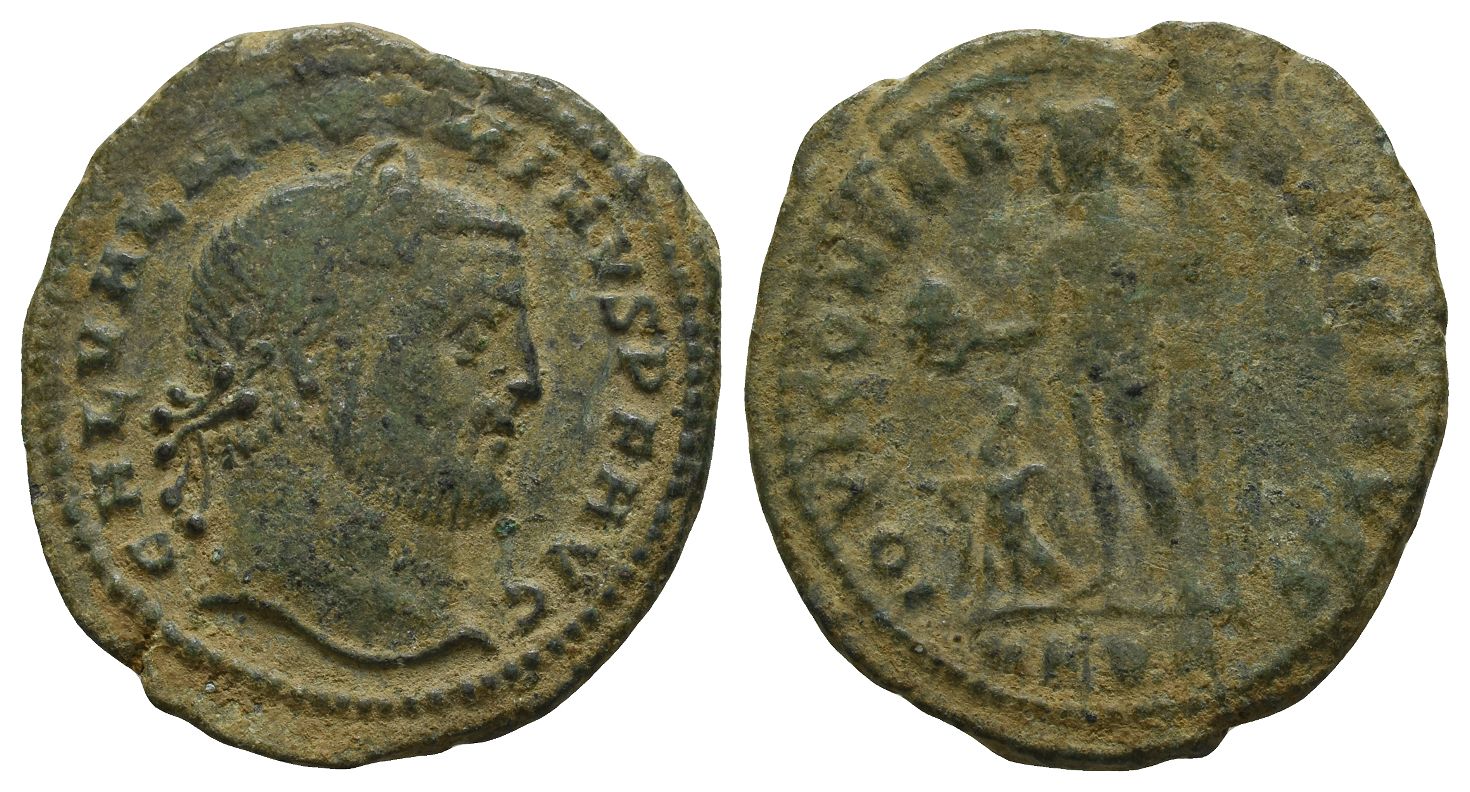 1st officina. GAL VAL MAXIMINVS P F AVG, laureate head to right / IOVI CONSERVATORI AVGG, Jupiter standing to left, chlamys hanging from left shoulder, holding globe and sceptre, eagle with wreath in beak at foot left; MKVA in exergue. RIC VI 79. 6.17gr, 26mm, 12h.