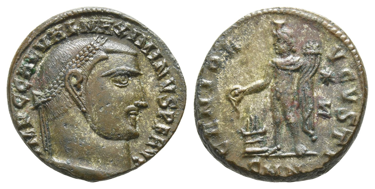 IMP C GAL VAL MAXIMINVS P F AVG, laureate head to right / GENIO AVGVSTI, Genius standing to left, holding patera, from which liquor flows, and cornucopia, altar on left; star above Z (retrograde) in right field, SMN in exergue. RIC VI 74b. 4.88gr, 20mm, 1h.
