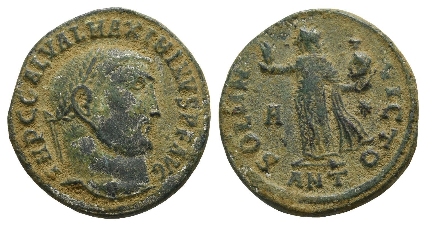 IMP C GAL VAL MAXIMINVS P F AVG, laureate head to right / SOLI INVICTO, Sol in long robe, standing facing, head to left, with hand raised and other holding head of Serapis; A in left field, star in right field, ANT in exergue. RIC VI 167b. 4.48gr, 21mm, 11h.