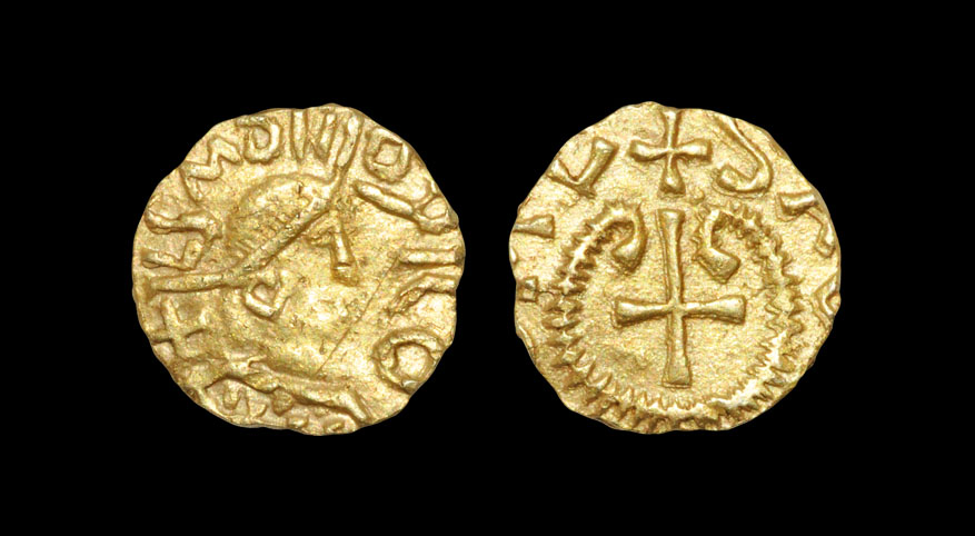 Circa 7th century AD, enigmatic issue. Obv: diademed profile bust right with the diadem ends extending through the legend and +/LSMd(N)/OVICO legend; the N possibly an extension of the diadem front jewel. Rev: equal armed cross within 'torc' inner border with +SAV[ ]MV legend. 1.26 grams.