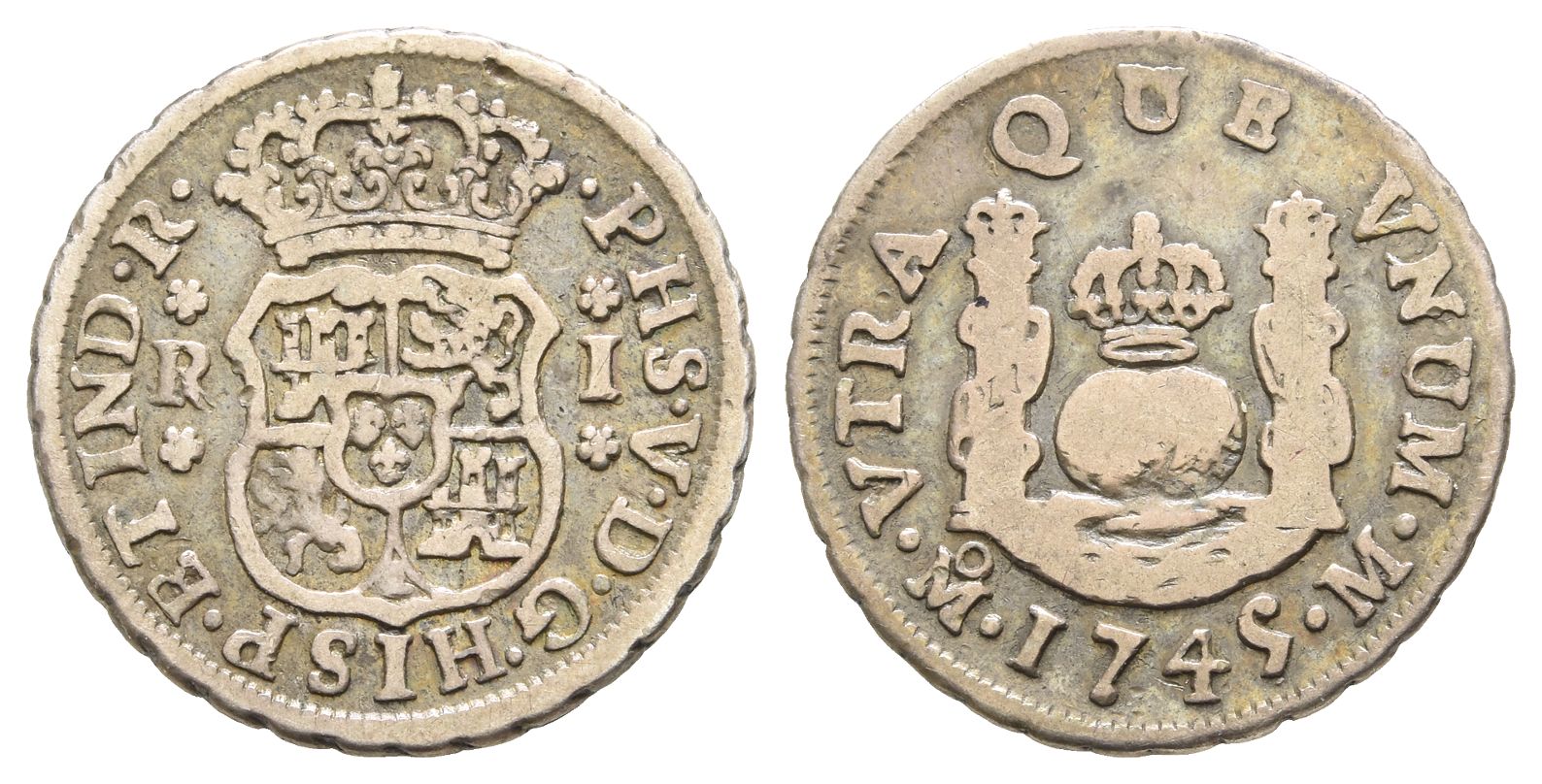 • PHS • V • D • G • HISP • ET IND • R •, crowned arms shield; R I (denomination) flanking / VTRA QUE VNUM, crowned hemispheres flanked by pillars; • Mᴼ • 1745 • M • below. KM 75.2. 3.20gr, 20mm, 12h.