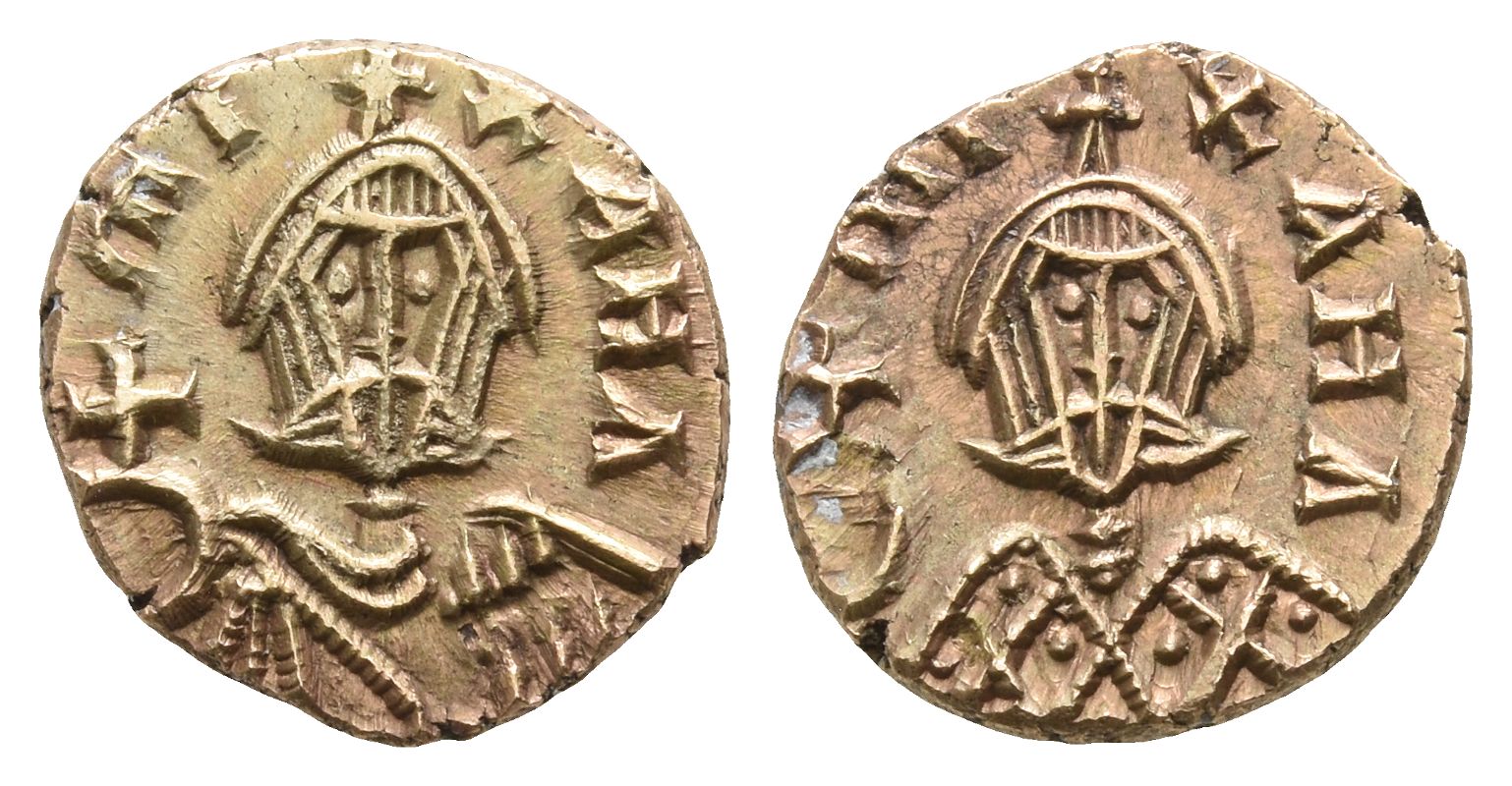 MIXAHΛ, crowned facing bust, wearing chlamys and holding globus cruciger / MIXAHΛ, crowned facing bust, wearing loros, holding globus cruciger. DOC 10; SB 1695. 1.60gr, 13mm, 6h.