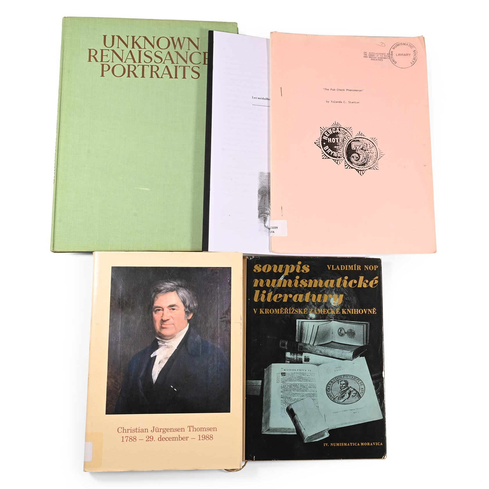 L. Goldscheider (ed.) - Unknown Renaissance Portraits - London, 1952, hardback, cloth covers, 14 pp, monochrome plates; M. van Daele - Les Médailles des Khédives et des Rois d'Egypte - Bruxelles, 2009, card covers, 33 pp, perspex outer boards; Y.C. Stanton - The Pub Check Phenomenon - Monmouth, 1998, card covers, 25 pp, monochrome figures; U.L. hansen (ed.) - Christian Jürgensen Thomsen 1788-29 december 1988 - København, 1988, hardback with dustwrapper, 227 pp., text figures; V. Nop - Soupis Numismatické Literatury : Numismatica Moravica IV - Brno, 1974, hardback with dustwrapper, 103 pp, monochrome plates. 2.31 kg total, 24 x 17.4 - 31 x 23 cm