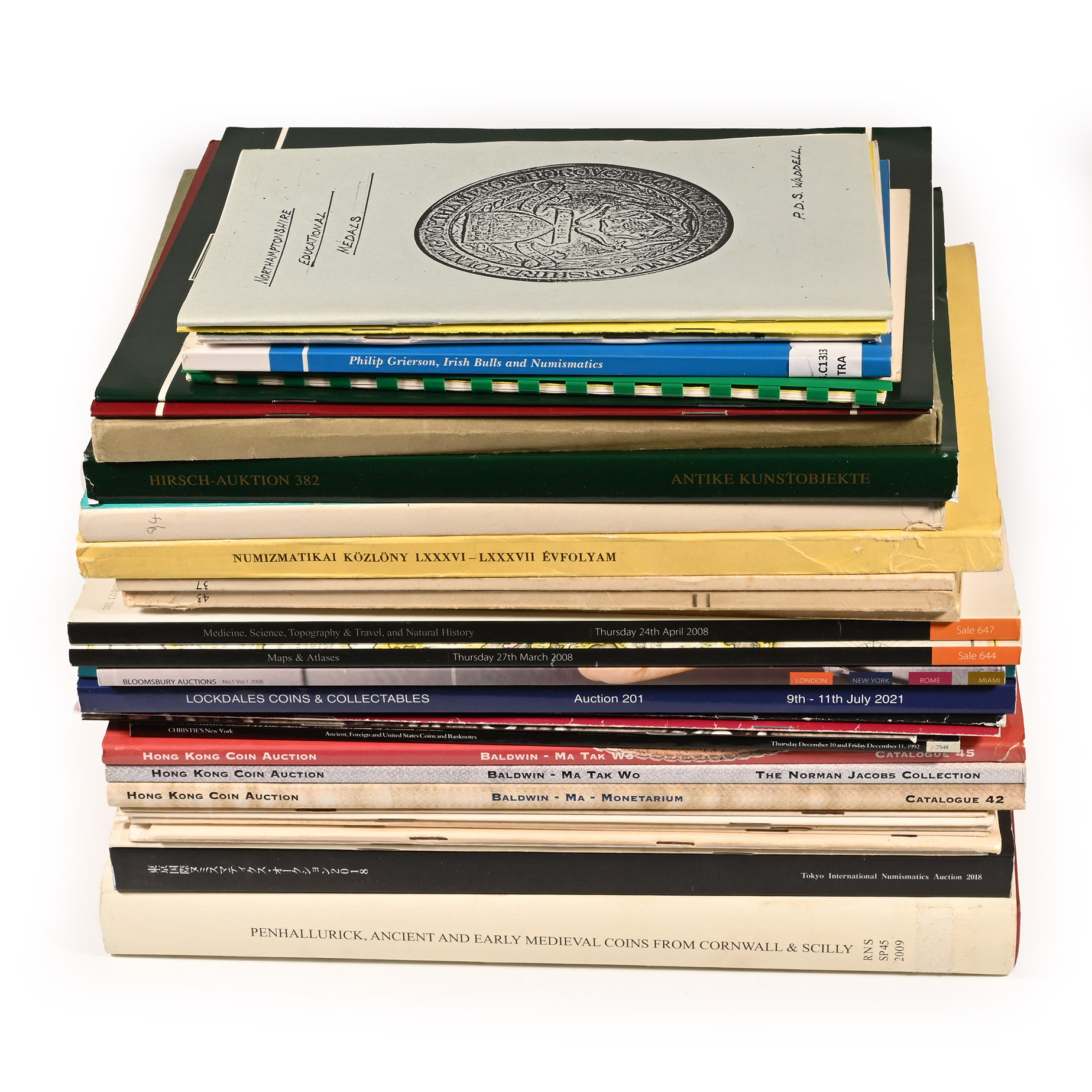 Comprising: R.D. Penhallurick - Royal Numismatic Society: Ancient and early Medieval Coins from Cornwall & Scilly - London, 2009, hardback with dustwrapper; Taisei/Spink: Tokyo Auction 20th April 2018; Hong Kong Auction: 30th August 2007; 27th August 2008; 28th August 2008; Sotheby: 12th June 1974; Christie's: 10th-11th December 1992; Spink: 21st August-24th September 2013; Boletin Numismatico (Cuba): January 1986; May 1986; July 1986; September-October 1986; November-December 1986; January-February 1987; March-April 1987; May-June 1987; July-August 1987; John Mowbray: 15th November 2002; Dolphin Coins List Winter 1995-6; Lockdales: 9th-11th July 2021; Paulucci: 15th March 2001; Bloomsbury: Vol.1, (undated) 2008; 27th March 2008; 24th April 2008; Monnaies et Médailles: 37, 5th December 1968; 43, 12th-13th November 1970; 53, 29th November 1977; Numismatikai Kozlony LXXXVI-LXXXVII, 1987-88; Hirsch: Auktion 21st-24th October 1975; 19th-20th September 2023; Glendinings: 4th November 1992; 7th July 1993; Waddell - Northamptonshire Educational Medals - paper covers, no date; Local Numismatics: School Attendance Medals - paper covers, no date; Wallis & Wallis: 7th April 1982; Monete: vol 5: Philip Grierson, Irish Bulls and Numismatics - card covers, 2011; A. Porritt - Matthew Young and his Numismatic Correspondents a Century and a Half Ago - card covers, no date; H. Mernick - London School Attendance Medals - card covers (1982). 12.4 kg total, 21 x 15 - 30.5 x 22 cm
