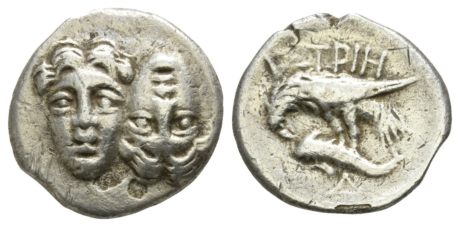 Two young male heads facing, right head inverted / IΣTPIH above sea-eagle on dolphin to left; monogram of ΔI below. SNG BM Black Sea 253; BMC 3; HGC 3.2, 1802. 4.15gr, 19mm, 12h.