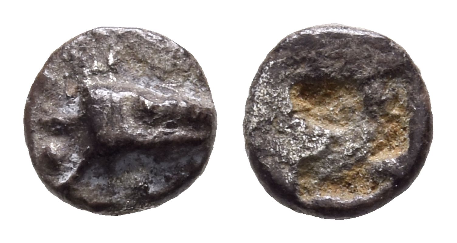 Head of tunny fish to right; two pellets to left and one below / Quadripartite incuse square. Von Fritze, Nomisma IX Kyzikos, Gruppe I 2, Tafel V 2; cf. SNG von Aulock 7324 (obol). 0.25gr, 6mm.
