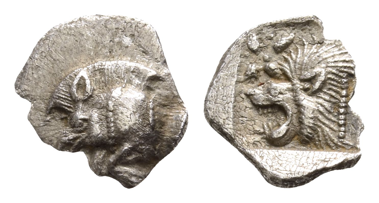 Forepart of boar to left with short mane and dotted truncation; to right, tunny fish / Head of roaring lion to left with bristling mane, outstretched tongue, and dotted truncation, in upper left field, star with four rays; all within incuse square. Von Fritze II 14; SNG Arikantürk 446-447; SNG BnF 275. 0.33gr, 9mm, 3h.