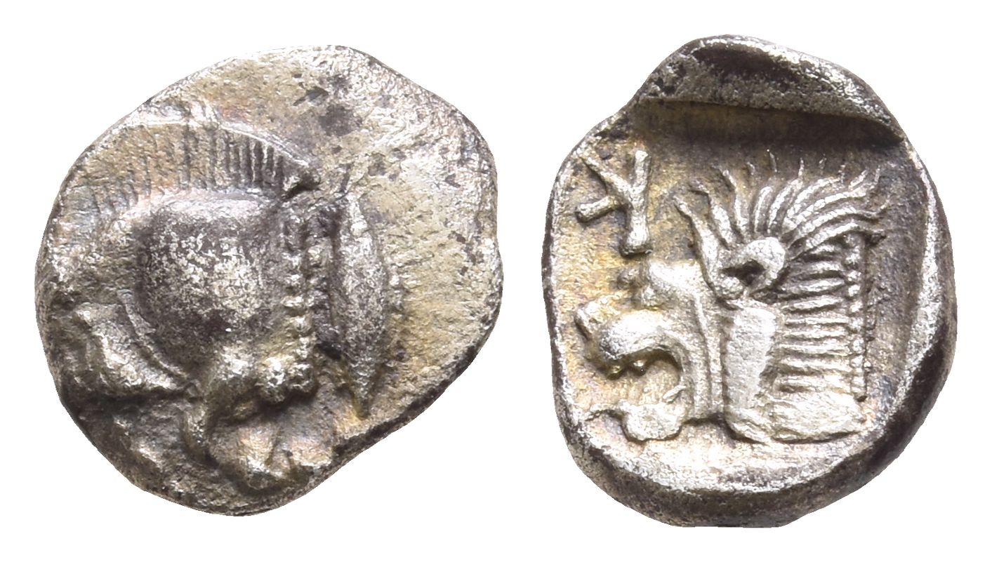 Forepart of boar to left; to right, tunny downward / Head of roaring lion to left; retrograde K to upper left; all within incuse square. Von Fritze II 15; SNG BN 380-4. 0.80gr, 11mm, 11h.