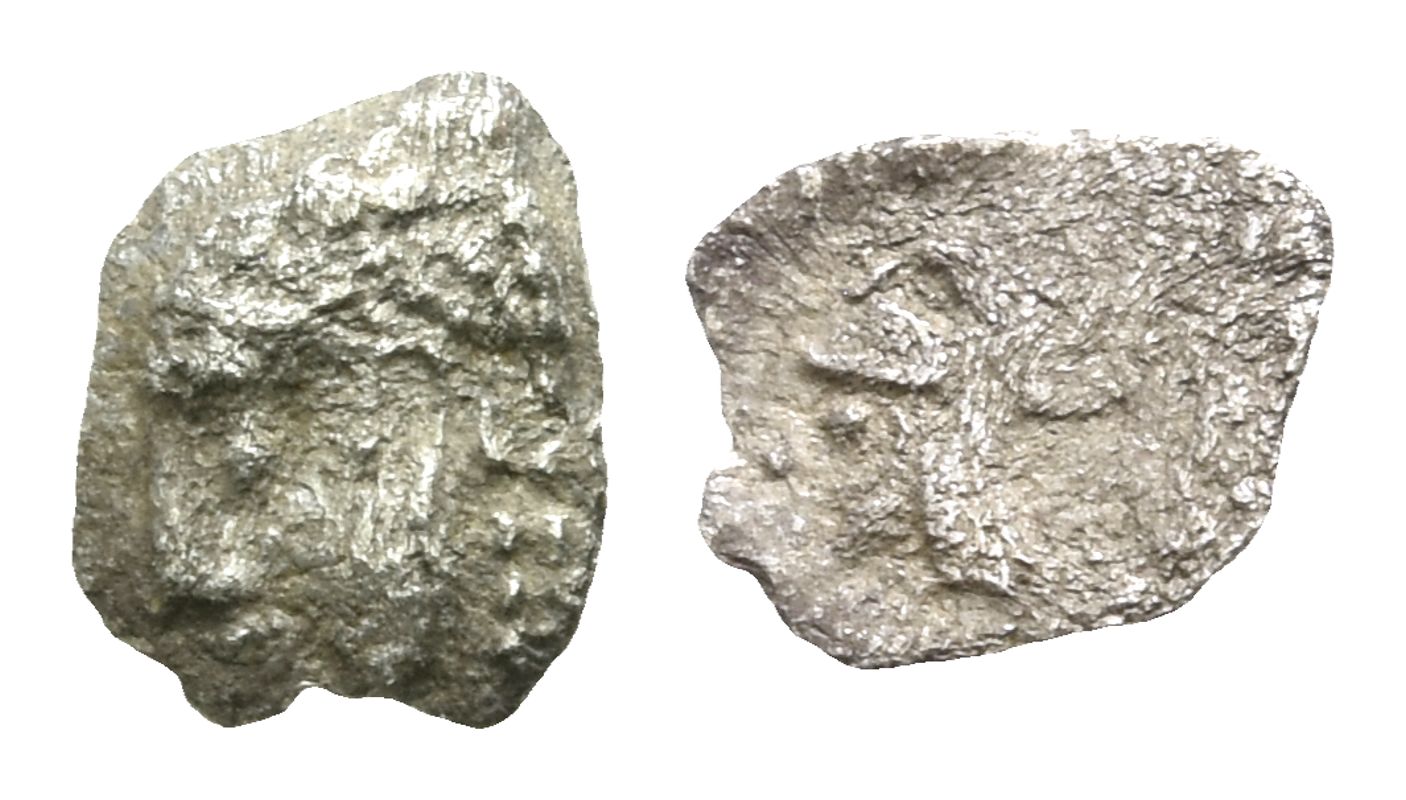 Archaic style female(?) head to left, wearing tainia / Helmetted head of Athena to left within incuse square. Cf. SNG Arikantürk 3, 613. 0.15gr, 6mm, 10h.