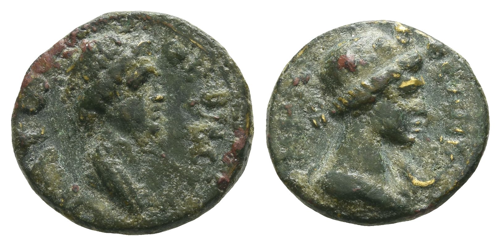 ΘЄΟΝ ΣΥΝΚΛΗΤΟΝ, draped bust of Senate to right / ΘΕΑΝ ΡΩΜΗΝ, draped bust of Roma to right; crescent before. RPC III 1750; BMC 212-13. 2.82gr, 17mm, 12h.