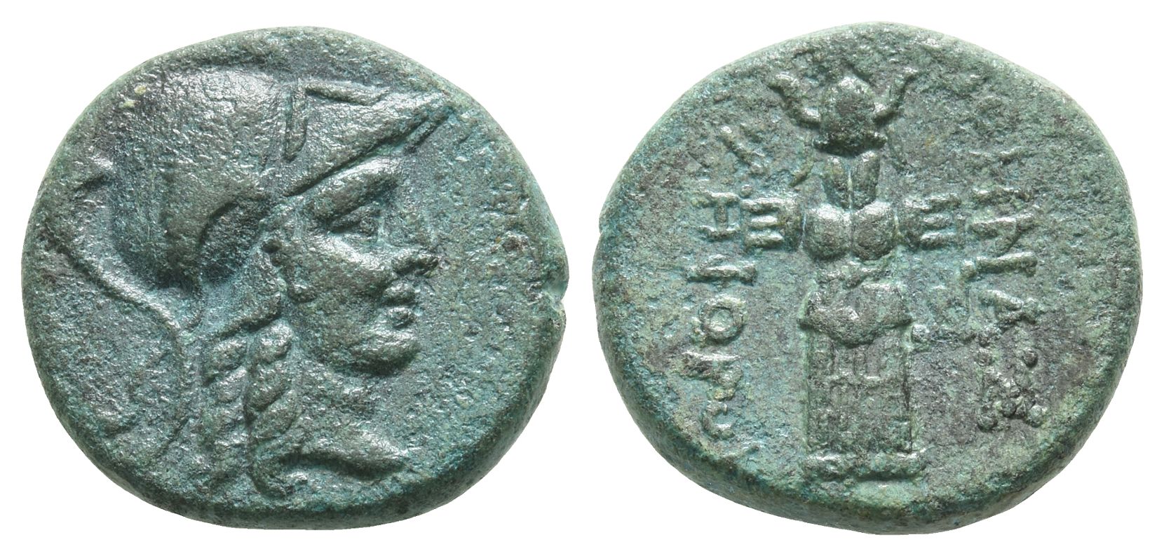 Head of Athena to right, wearing Corinthian helmet / ΑΘΗΝΑΣ [Ν]ΙΚΗΦΟΡΟY, trophy consisting of helmet and cuirass; inner right, monogram. SNG BnF 1893 var. (monogram to inner left). 6.40gr, 19mm, 12h.