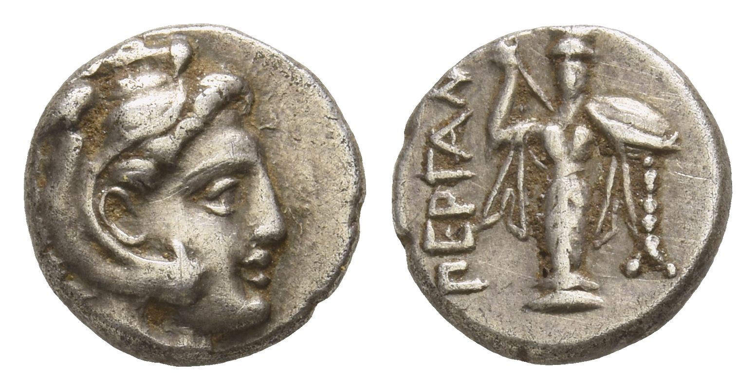 Head of Herakles to right, wearing lion skin headdress / Archaistic Palladion: statue of Pallas Athena standing facing, holding spear and shield; ΠEPΓAM upwards to left. Von Fritze, Pergamon, pl. I, 10; SNG BnF 1559-66; Klein 278. 1.28gr, 11mm, 11h