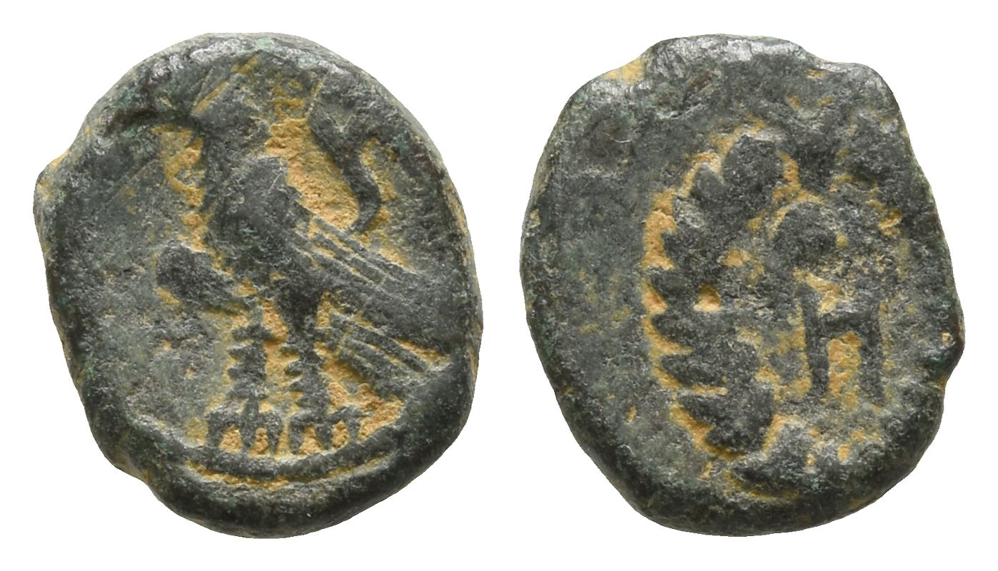 Petra mint; struck circa 8/7 BC-AD 15/6. Aramaic letter hēth within laurel wreath / Eagle to left with wings closed; Aramaic letter ḥēth behind. CN 156; Schmitt-Korte II, 64. 1.14gr, 11mm, 1h.