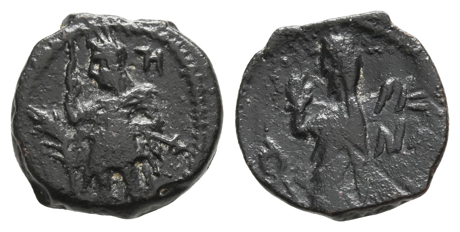 Petra mint. Undated, but attributed to years AD 26-48. Aretas, in military attire, standing facing, head to left, holding spear and sword; Aramaic ligate letters to top right, palm frond to left / Shaqilat, veiled, standing to left, raising hand; 'Shaqilat' in Aramaic to right, wreath to left. CN 187a; cf. Meshorer, Nabataea 69. 2.75gr, 15mm, 12h.