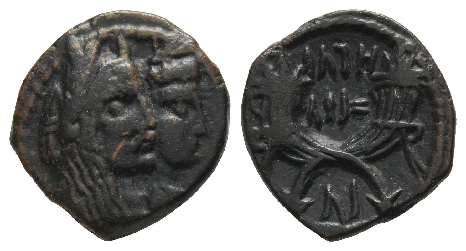Petra mint; struck AD 20-40. Jugate busts of Aretas and Shaqilat to right; [H F?] in Aramaic across fields / Crossed cornucopiae; legend in Aramaic between and below. Cf. Meshorer, Nabataea 114. 3.80gr, 17mm, 12h.