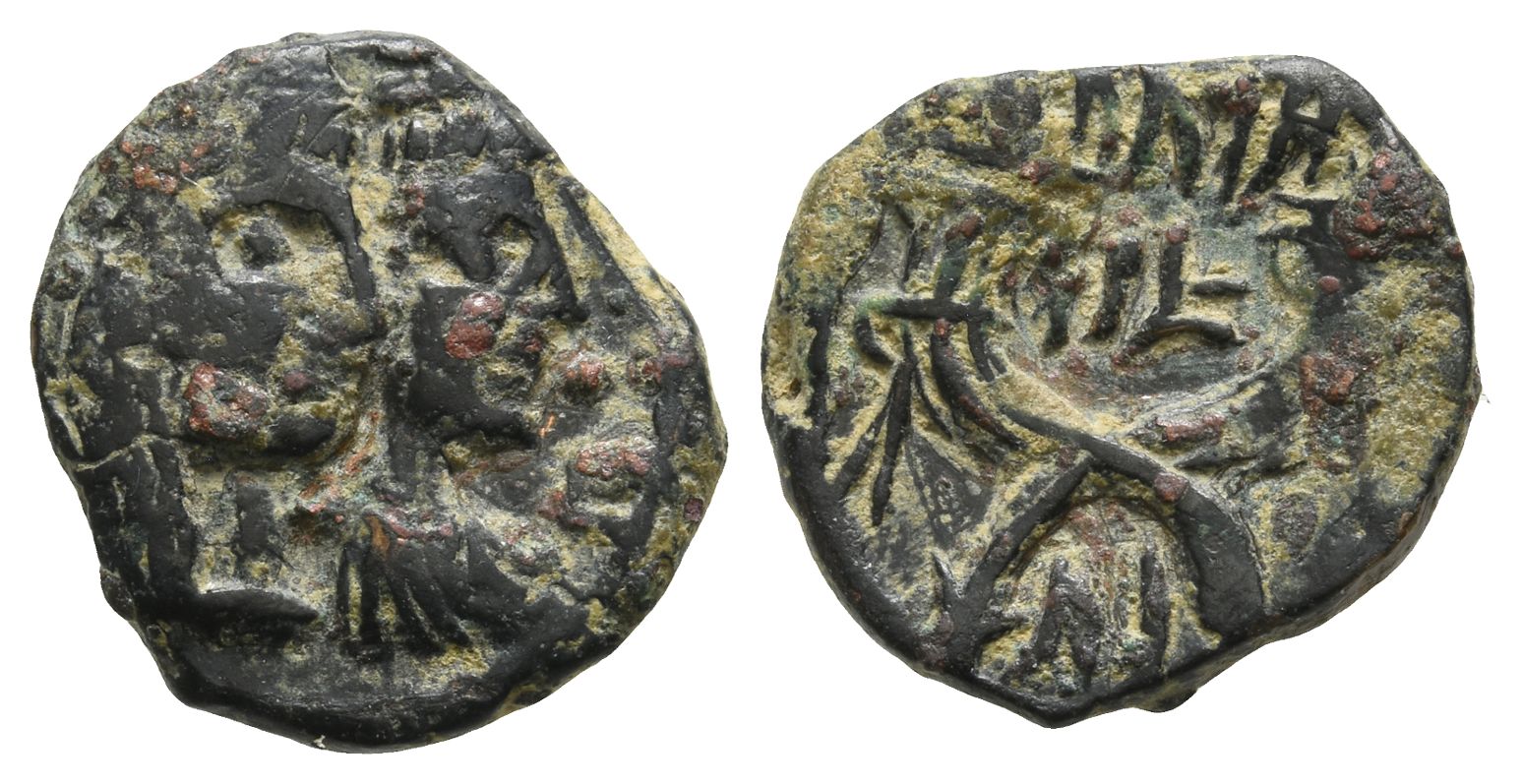 Jugate busts of Aretas and Shaqilat to right; [H]-F in Aramaic across fields / Crossed cornucopiae; legend in Aramaic between and below. Cf. Meshorer, Nabataea 114. 3.73gr, 18mm, 11h.