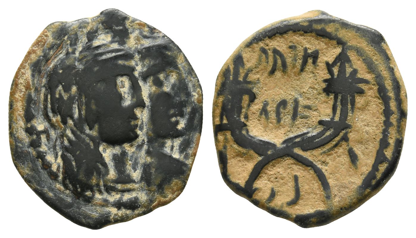 Jugate busts of Aretas and Shaqilat to right; H-[F?] in Aramaic across fields / Crossed cornucopiae; legend in Aramaic between and below. Cf. Meshorer, Nabataea 114. 3.54gr, 19mm, 1h.