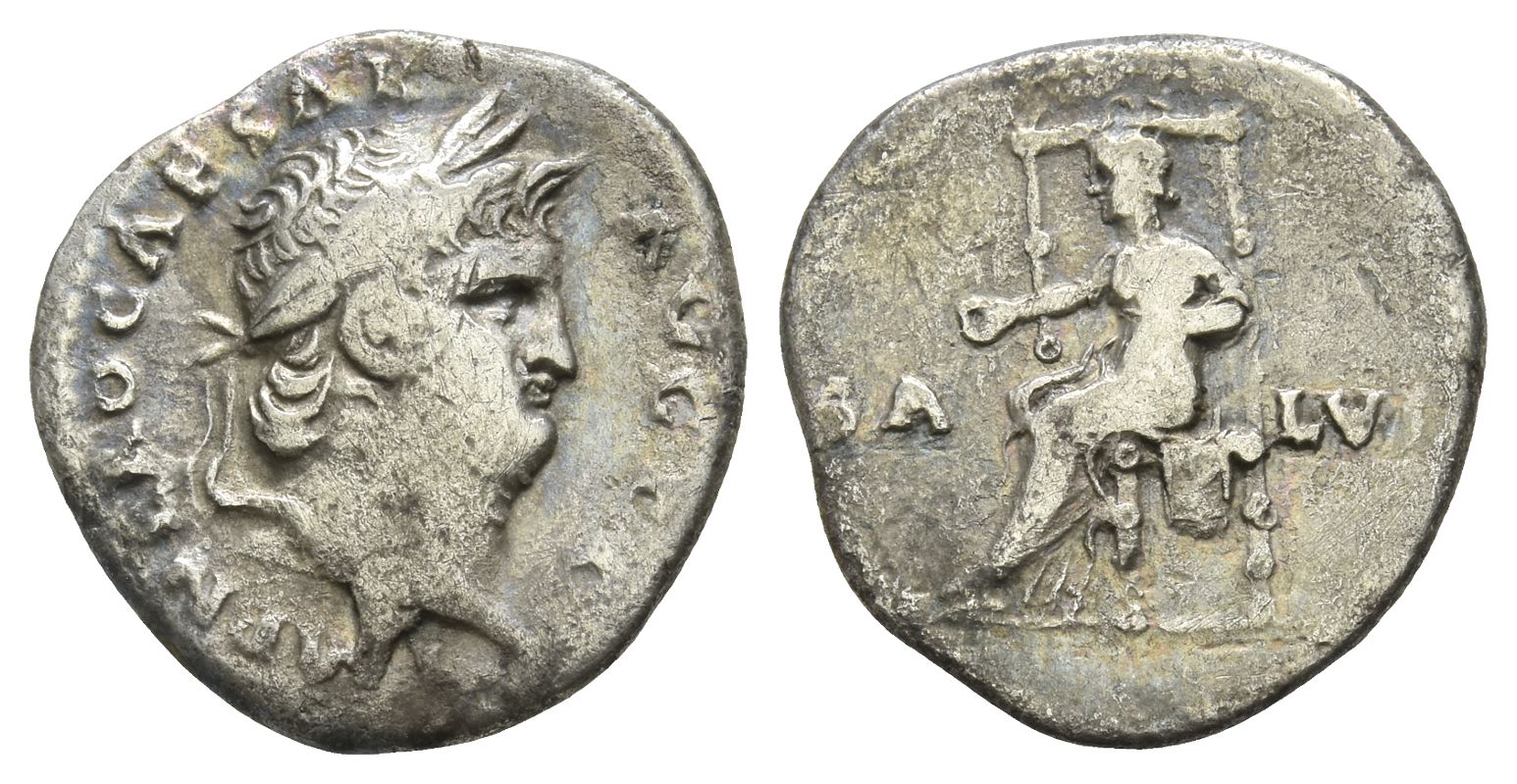 IMP NERO CAESAR AVG P P, laureate head to right / SA-LVS, Salus seated to left on ornamented throne, holding patera and resting left hand at side. RIC I 72; RSC 320. 3.05gr, 18mm, 4h.