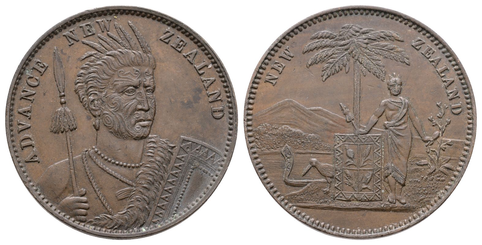 ADVANCE NEW ZEALAND, Māori warrior with moko (facial tattoo) facing slightly to right, holding spear with right hand and shield with left / NEW ZEALAND, Māori warrior standing facing, holding shield and spear with right hand and patu with left; palm tree, kiwi, mountains and Waka in background. KM Tn49. 13.27gr, 34mm, 6h