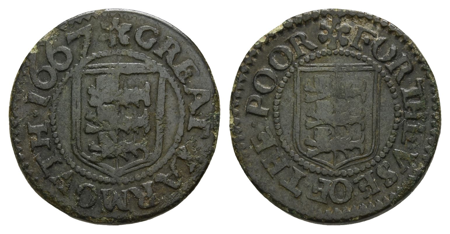 GREAT YARMOUTH 1667, Borough arms / FOR THE VSE OF THE POOR, Borough arms. Dickinson p.169, 284/5. 2.79gr, 18mm, 6h.
