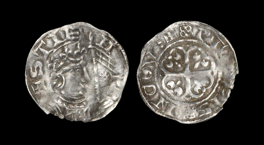 136-1154 AD, York group, circa 1150 AD. Obv: profile bust with lance and flag and mullet below and +STIEFNE R legend. Rev: cross moline with fleurs in angles and +*PT[I]*ETS*NC*V legend with triple pellet after V and where * represents four ornamental symbols within the legend. 0.95 grams.