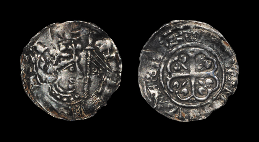 1136-1154 AD, York group. Obv: profile bust with lance and flag with mullet below and +STIEFNE R legend. Rev: cross moline with fleurs in angles and +*RIS*[ ]*M[ ]NEV* legend for York mint where * represents four ornament symbols such as quatrefoil, rosette and pierced annulet. 1.12 grams.