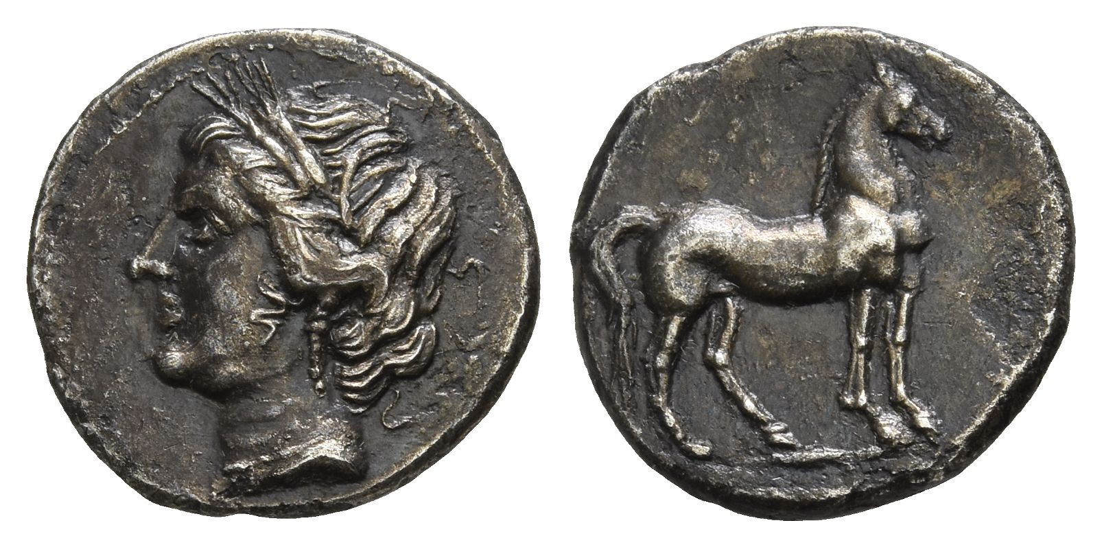 Uncertain Punic mint in Bruttium (or Lokris?) under Carthaginian occupation. Wreathed head of Tanit to left / Horse standing to right. Jenkins, Some L2; Robinson, Second p. 53, 3; HN Italy 2020; SNG Copenhagen 369. 1.94gr, 14mm, 7h.