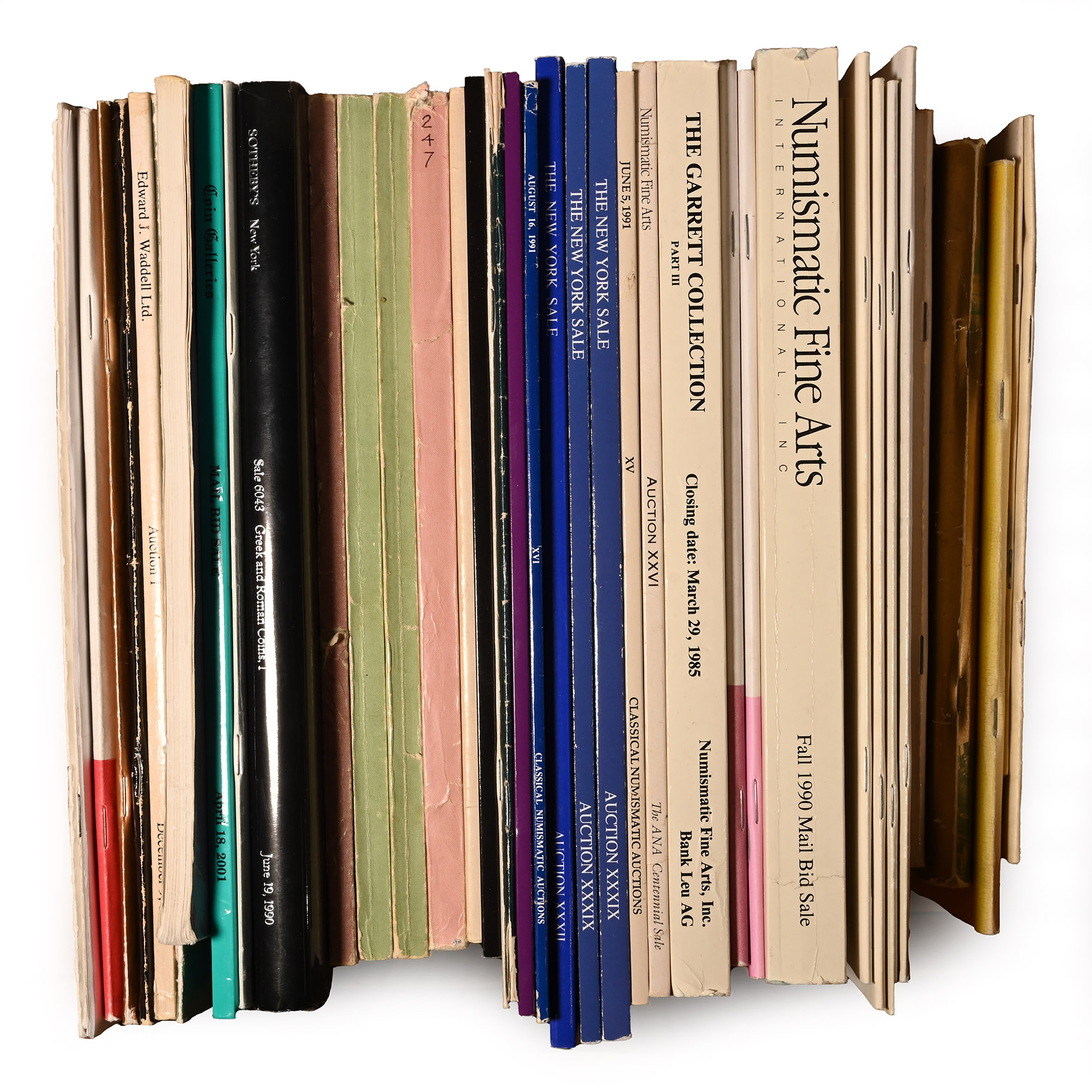 Comprising: Jacques Schulman: 28th-31st March 1960; 5th-9th June 1961 (2 copies); 7th-10th May 1968; 19th November 1968; October 1977; October 1978; Hans M.F. Schulman: 17th-19th January 1963; 18th-19th March 1966; Schulman Coin & Mint: 25th-27th October 1971; Frank L. Kovacs: 30th November 1995; 3rd June 1998; 16th October 1998 (2 copies); 1st October 2003 (2 copies); Edward J. Waddell: 9th December 1982; Alex G. Malloy: 4th June 1997; 23rd March 2000; 20th August 2001; Harlan J. Berck: 9th March 1995; 23rd March 1995; Stephen Album: August 2004; Kolbe/Spink: 12th December 1982; 11th December 1983; 7th December 1996; Numismatic Fine Arts: 29th November 1984; 29th March 1985; 18th October 1990; 14th August 1991; Coin Galleries: 18th April 2001; Classical Numismatic Review: Spring 1992; Fall,1995; Summer 2023; Classical Numismatic Auction: 5th June 1991; 16th August 1991; 13th October 2021; Sotheby's: 19th June 1990; Baldwins et al. New York Sale: 8th January 2014; 10th January 2017; 11th January 2017; Boletino Numismatico (Cuba): No.2, March 1986; The Medal Cabinet Issue 1, Summer 2000; Numizmatičke Vijesti No.VII,1960. 14.5 kg total, 21 x 16.6 - 29.5 x 21 cm