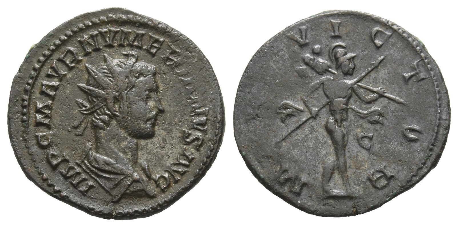 IMP C M AVR NVMERIANVS AVG, radiate, draped and cuirassed bust to right, seen from rear / M[ARS] VICTOR, Mars advancing to right, holding transverse spear and trophy; C in right field. RIC V.2 386; Cohen 24. 3.76gr, 22mm, 12h.