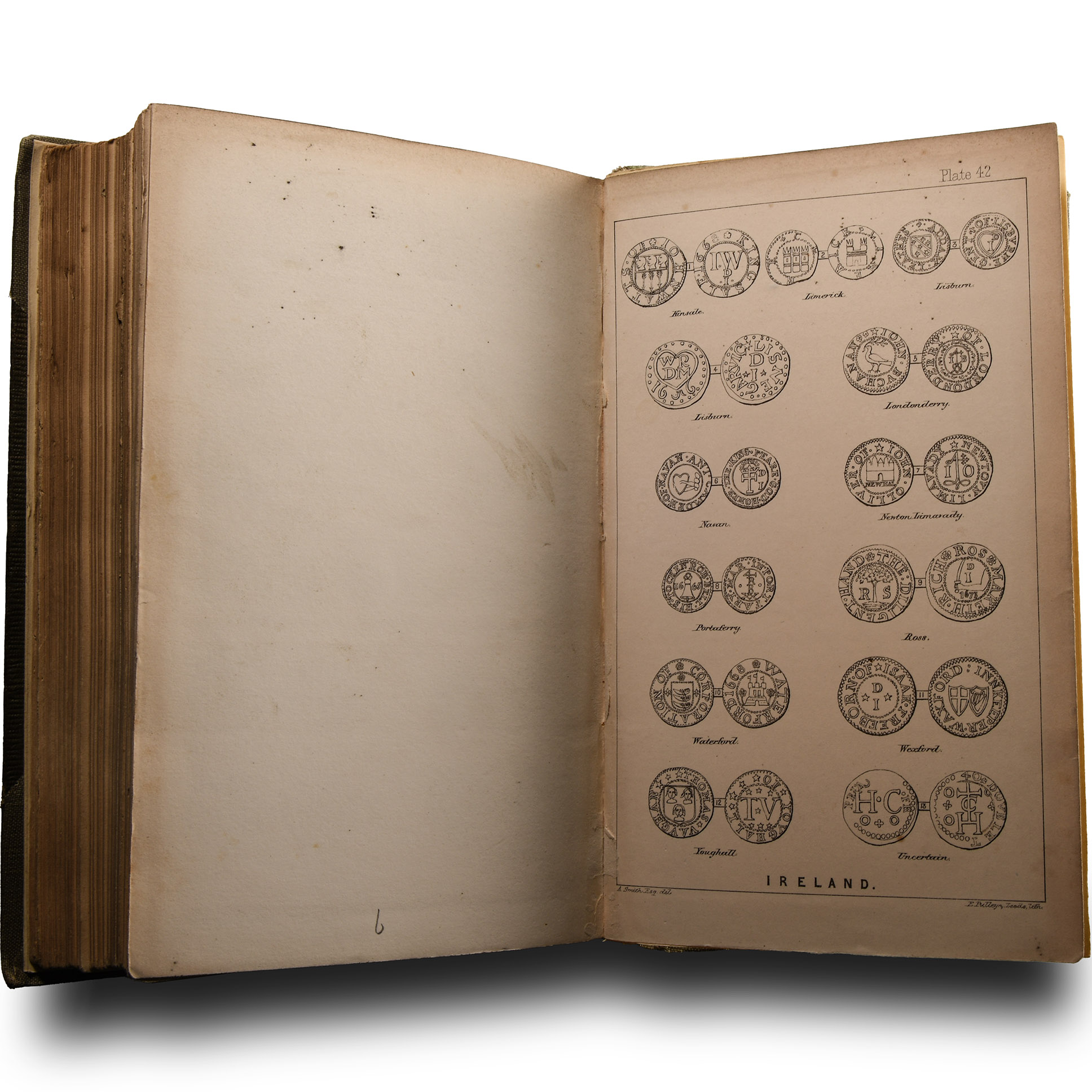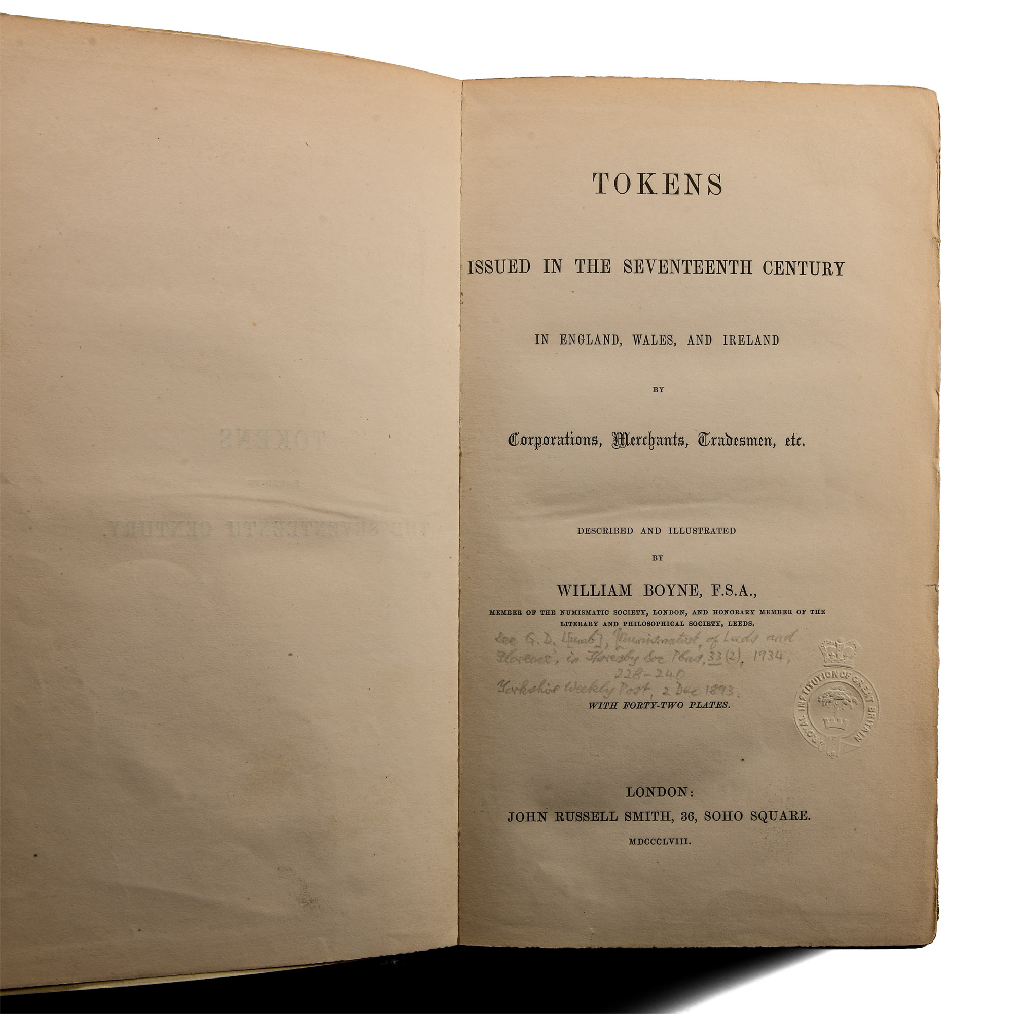 William Boyne - Tokens Issued in the Seventeenth Century in England, Wales, and Ireland by Corporations, Merchants, Tradesmen, etc. - John Russell Smith, London, 1858 - hardback, cloth covers, with moulded palmettes to boards, gold titling to spine - 630 pp, 42 plates. 1.23 kg, 23 x 16 cm