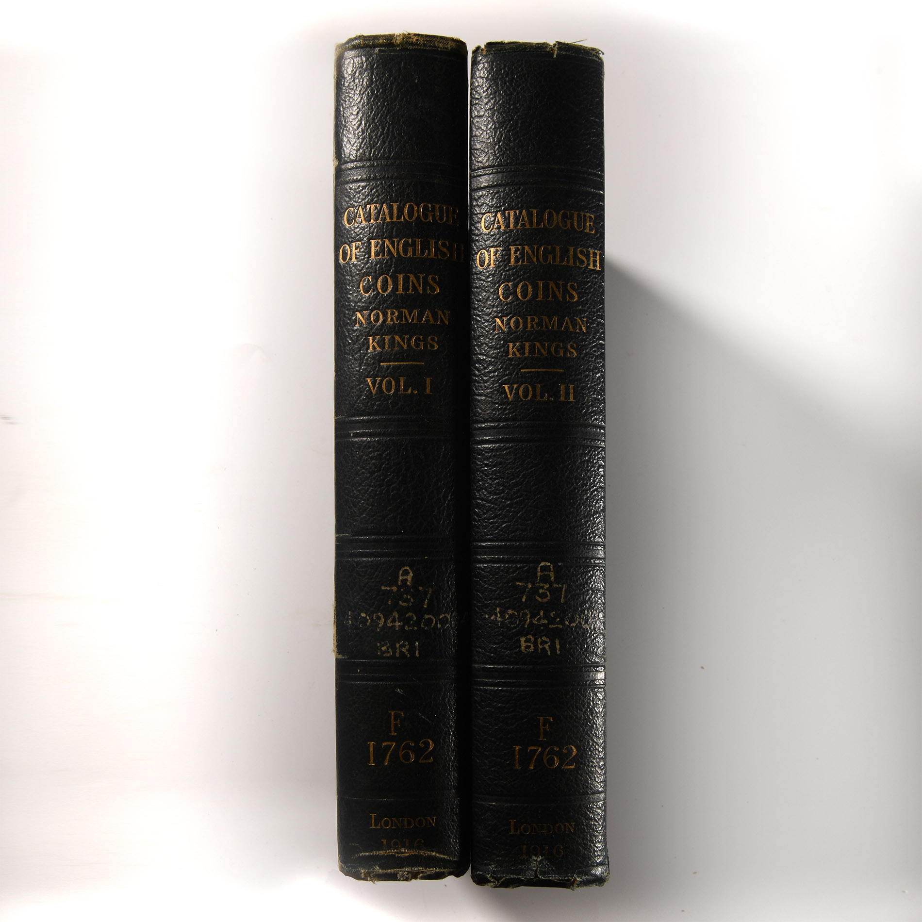 George Cyril Brooke - Catalogue of English Coins in the British Museum - The Norman Kings, Volume I & II - British Museum, London, 1916 -hardback, full leather library binding with gold titling to spne and impressed 'Liverpool Free Public Library' to cover -255 pp, fold-out table, 62 plates. 1.96 kg total, 24 x 16 cm each