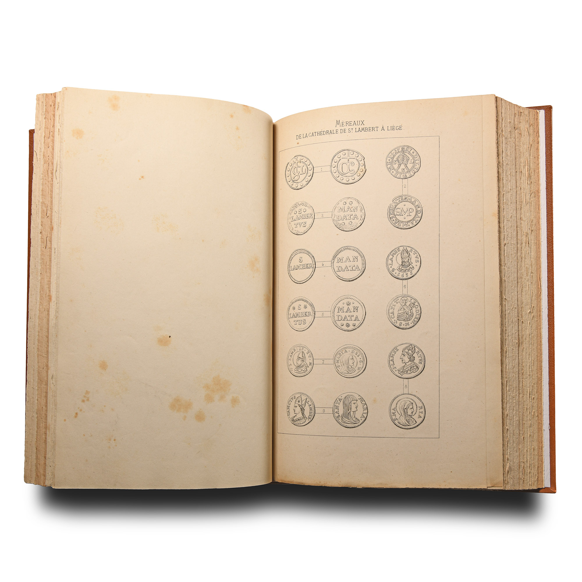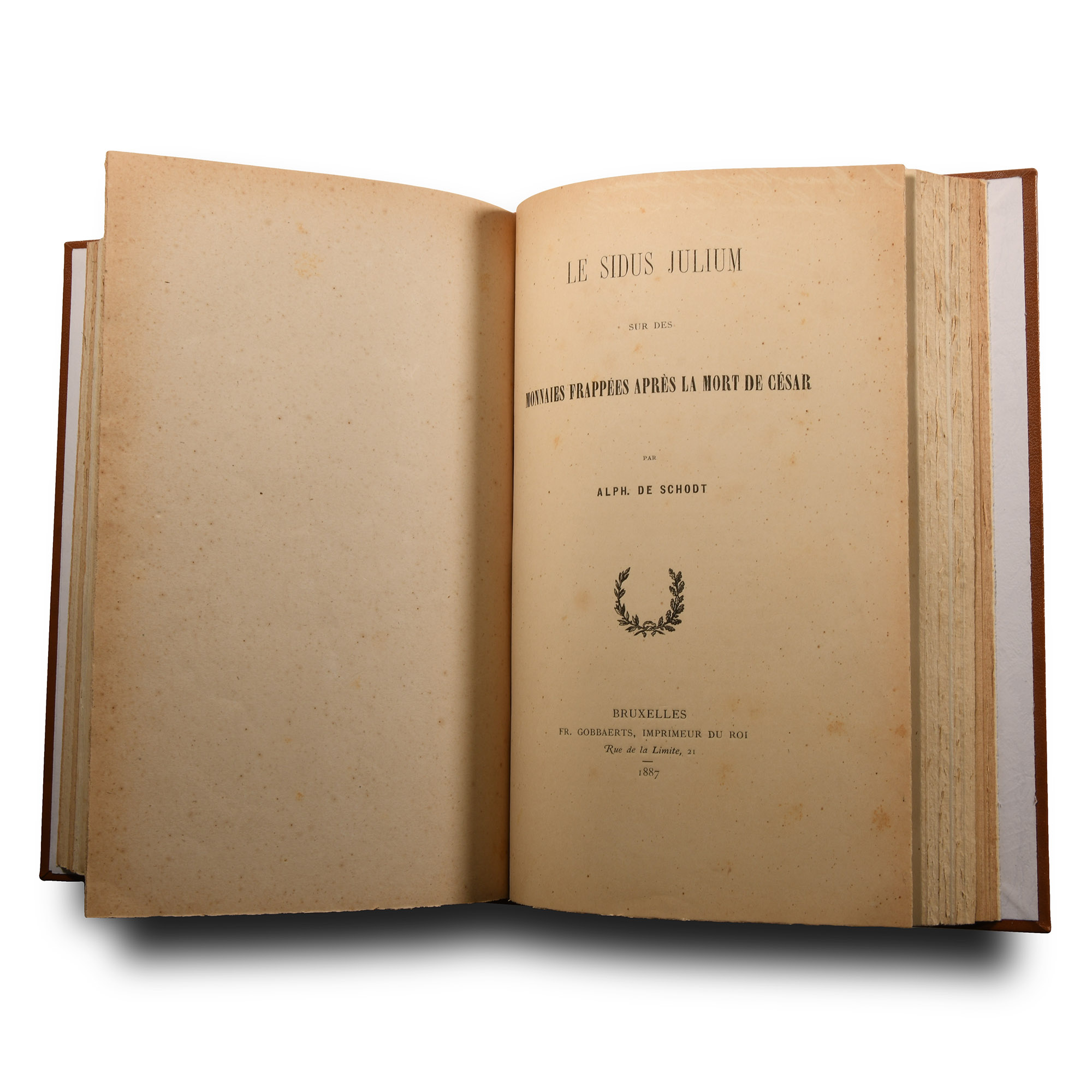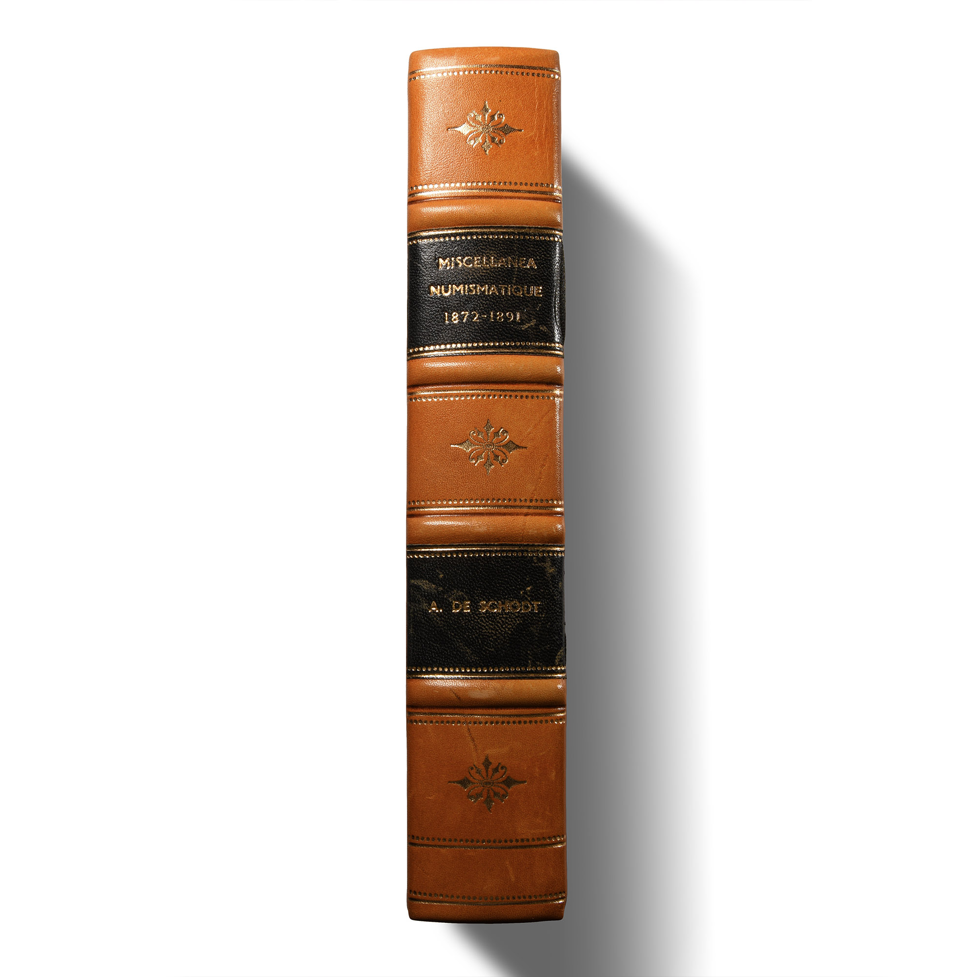 A. de Schodt - Miscellanea Numismatique De Bruges et Gand - bound offprints relating to the Numismatic history of Bruges and Ghent including: Société Royale de Numismatique - Assemblé générale annuelle de 1872, with handwritten dedication by de Schodt 'À mon ami et cher [...] le docteur Dugniolle. Souvenir affection[..]'; Le Jeton Comme Instrument de Calcul;Le Chapitre de Saint-Lambert, and other papers - rebound in hardback, full leather binding with gold titling to spine - original plates. 1.1 kg, 23.7 x 16 cm