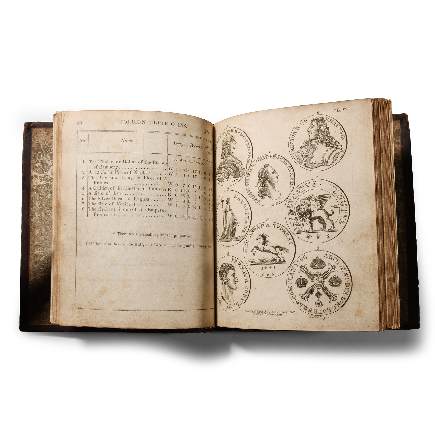 J. Ede - A View of the Gold and Silver Coins of All Nations Exhibited in above four hundred Copper Plate Engravings - Richardson, London, 1808 - leather binding with gold blocking to spine, marbled endpapers - 74 pp, 34 monochrome plates, with separate section concerning assaying and weights and another on Sir Isaac Newton's tables of foreign silver and gold coins, assaying tales, etc. 244 grams total, 15 x 13.5 cm
