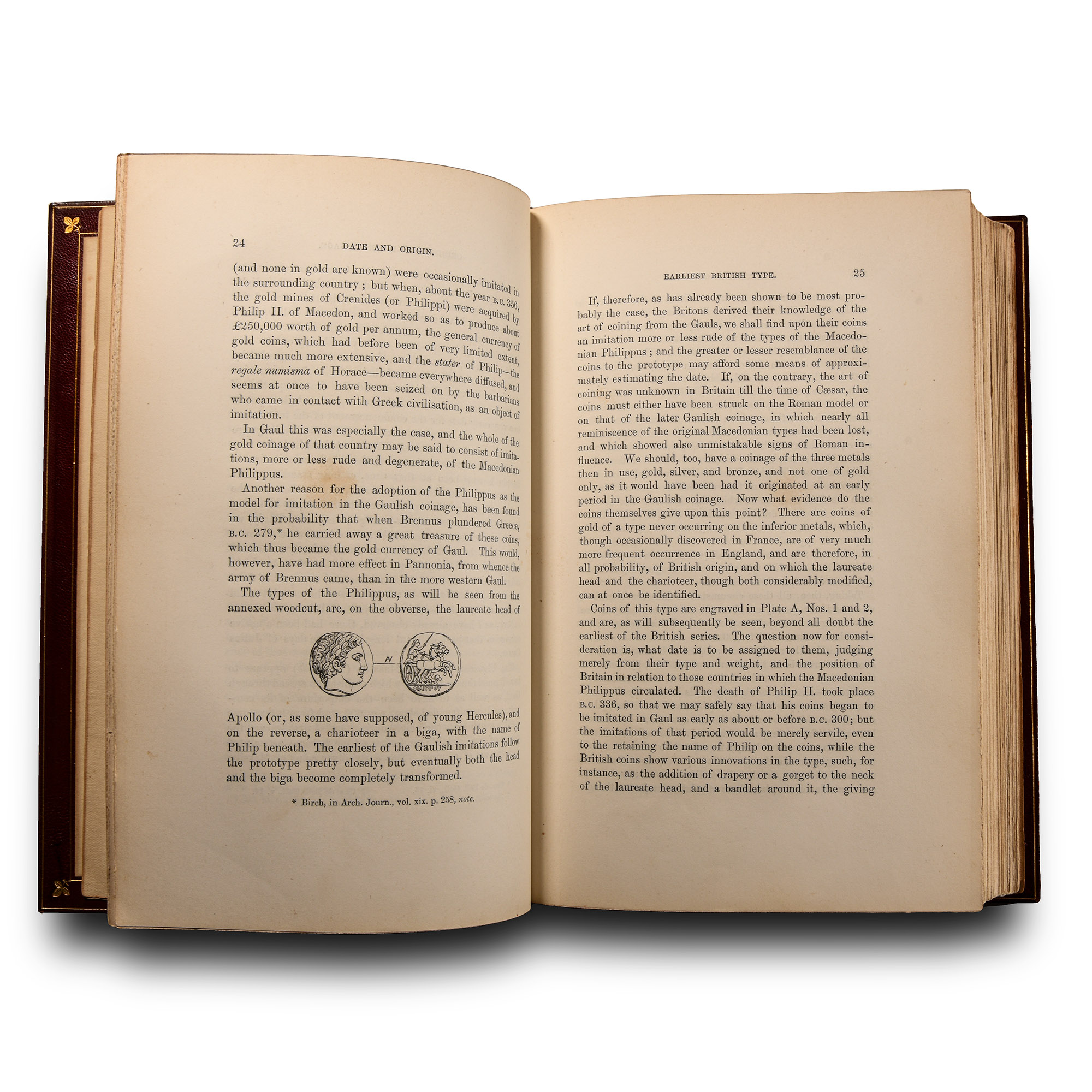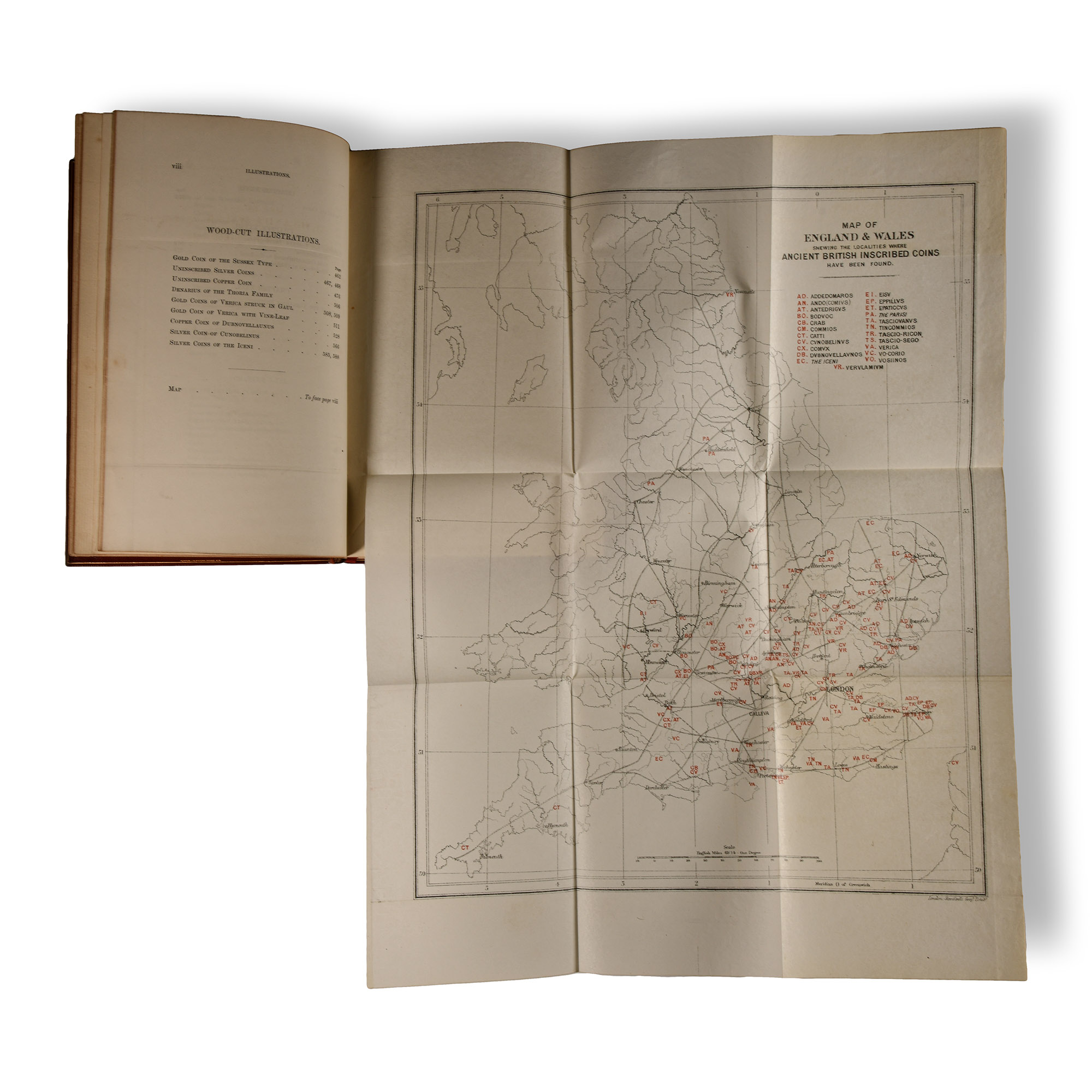 John Evans - The Coins of the Ancient Britons, London, 1864; with The Coins of the Ancient Britons Supplement, London, 1890 - hardback, matching contemporary red morocco, neatly re-backed with spines relaid, gold titling - 424 pp, 17 plates and 180 pp, 23 plates; with a loosely inserted postcard from John Evans to The Numismatic and Antiquarian Society of Philadelphia, dated 1900; copied extract from Ancient British Coins, (Rudd, 2010, p.3) with outline of Evans's achievements; Ex libris Harry Manville (1929-2015), with an earlier auction extract; acquired Douglas Saville, ex libris Chris Rudd, with bookplate to each; supplement with back cover detached. 2.02 kg total, 24 x 16 cm each