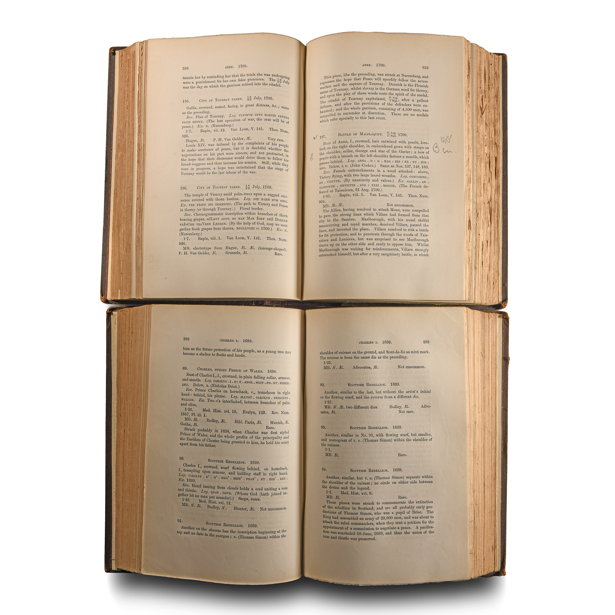 Hawkins, E., Franks, A.W. and Grueber, H.A., Medallic Illustrations of the History of Great Britain and Ireland to the death of George II, 2 vols, London, 1885, 724 + 866pp (Manville 515) [2]. Publishers’ brown cloth, spines gilt; some pencil checkmarks in a 19th century hand, otherwise a clean set, vol. I with illustrated 5pp article from The Connoisseur, August 1903, entitled Stuart Medals and Royalist Badges, by P. Berney-Ficklin, and vol. II with ALS from H.A. Grueber to Mr Berney-Ficklin, 13 July 1904, bound in at p.181, and referring to the Peace of Ryswick medal, M.I. II, 181/476; ex libris Philip Berney-Ficklin. 3.52 kg total, 24.5 x 17 cm each