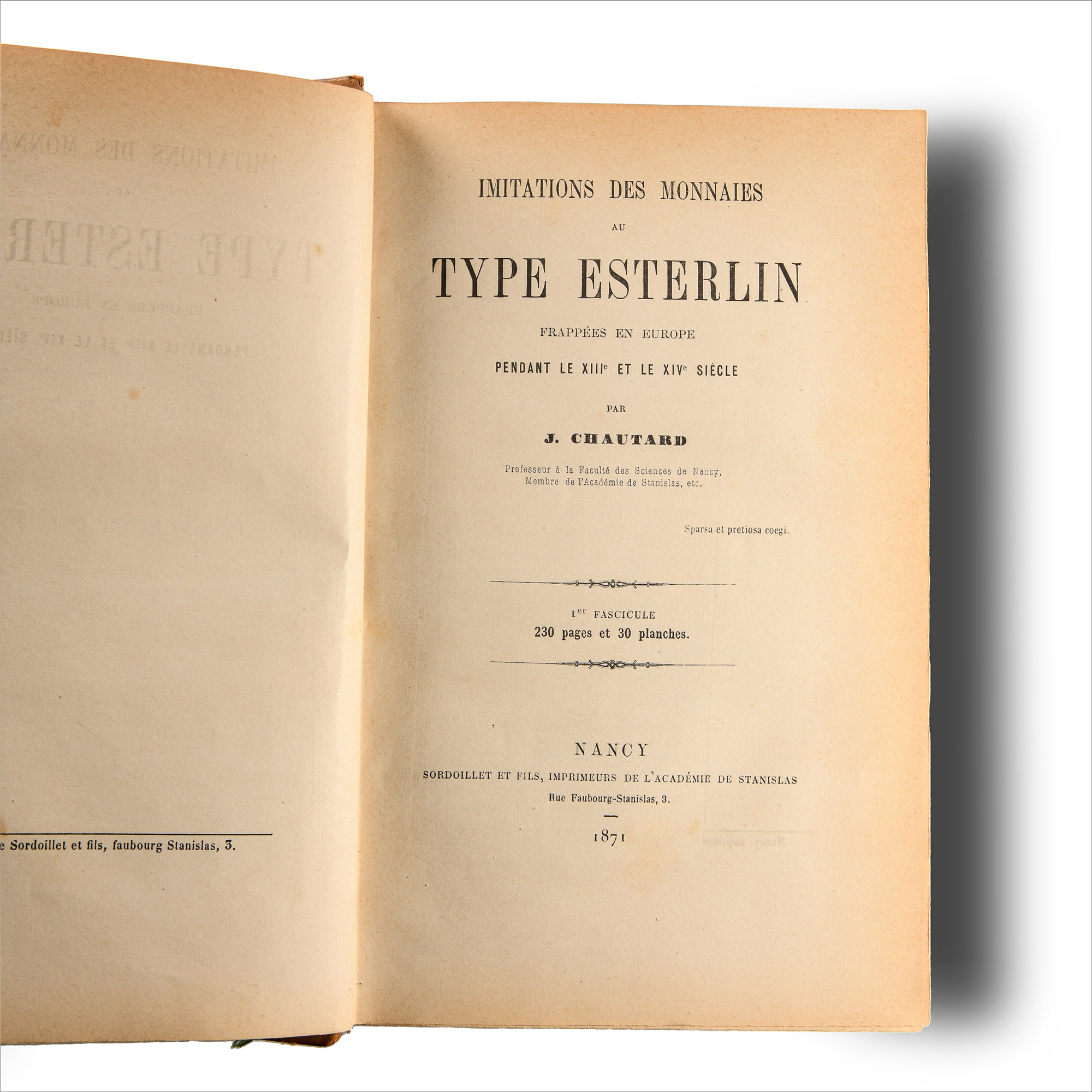 J. Chautard - Imitations Des Monnaies Au Type Esterlin Frappées en Europe - Sordoillet et Fils, Nancy, 1871 - hardback, marbled boards and leather spine with labels, gold titling, marbled endpapers - 484 pp, 36 plates. 1.08 kg, 22 x 15 cm