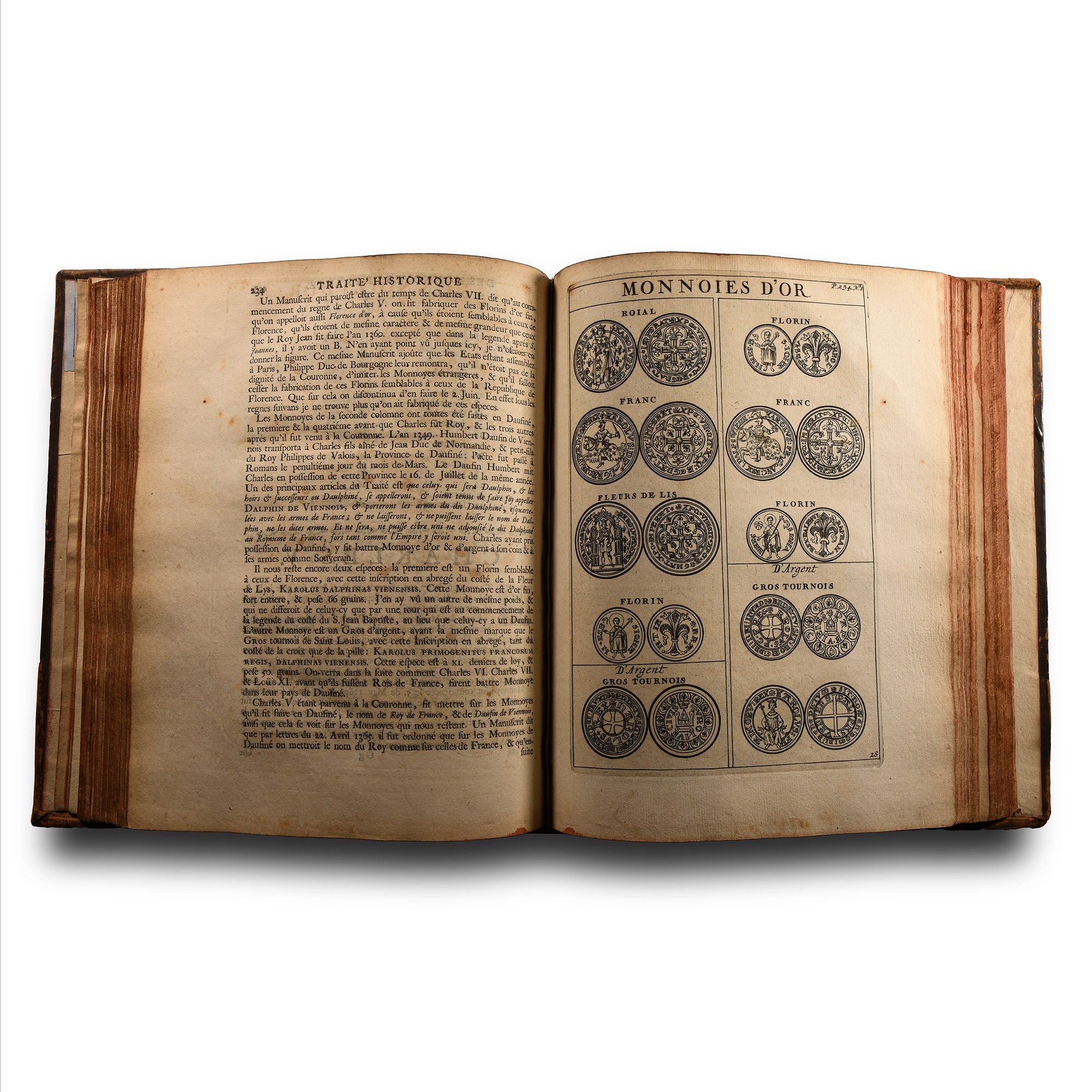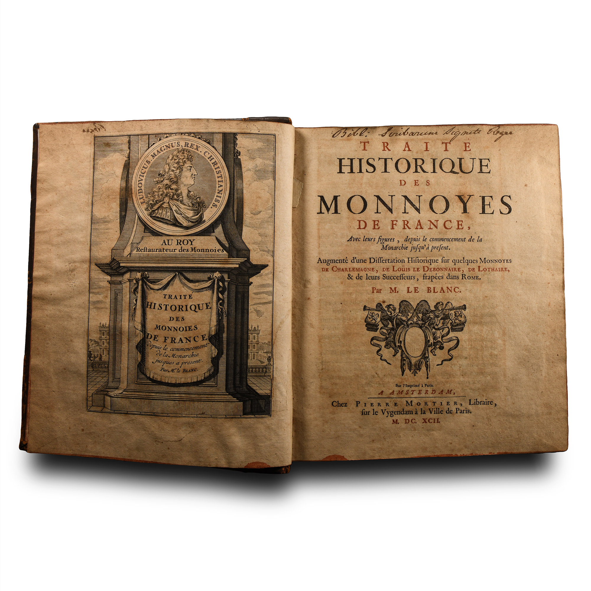 M. Le Blanc - Traité Historique des Monnoies de France with bound-in Dissertation Historique sur Quelques Monnaies de Charlemagne, etc.- Amsterdam, 1692 - hardback rebound with full leather binding with gold titling to spine, gold figure to front 'Society of Writers to the Signet' - 536 pp, text figures and plates; 'Avertissement' bound in before title page of Dissertation. 1.44 kg, 25 x 21 cm