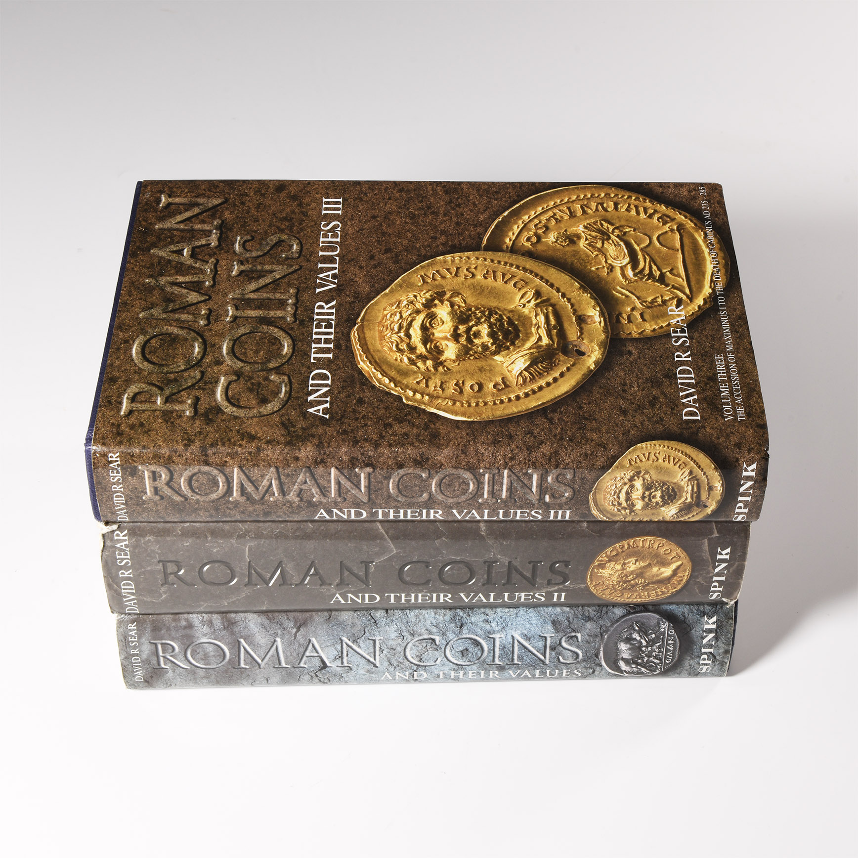 David R. Sear - Roman Coins and Their Values (Millennium Edition) Volume I - 2000, hardback with dustwrapper, 532 pp, monochrome images; Volume II - 2002, hardback with dustwrapper, 696 pp, monochrome images; Volume III - 2005, hardback with dustwrapper, 536 pp, monochrome images. 3.48 kg total, 22 x 14 cm each