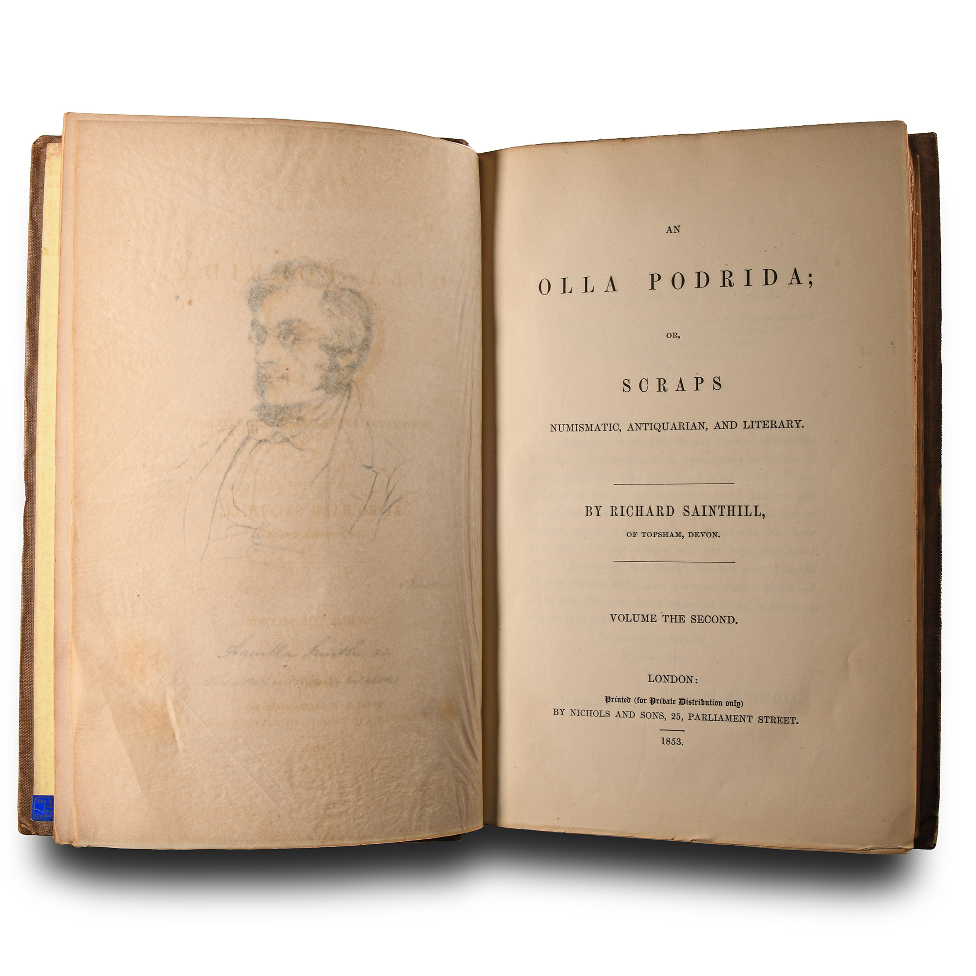 Richard Sainthill - An Olla Podrida or, Scraps Numismatic, Antiquarian, and Literary, Volume I & II - Nichols & Son, London, 1844 - hardback, cloth covers - Vol.I 388 pp, text figures and plates; II 444 pp, text figures and plates - each volume with handwritten dedication by the author. 2.22 kg total, 26.2 x 17.3 cm