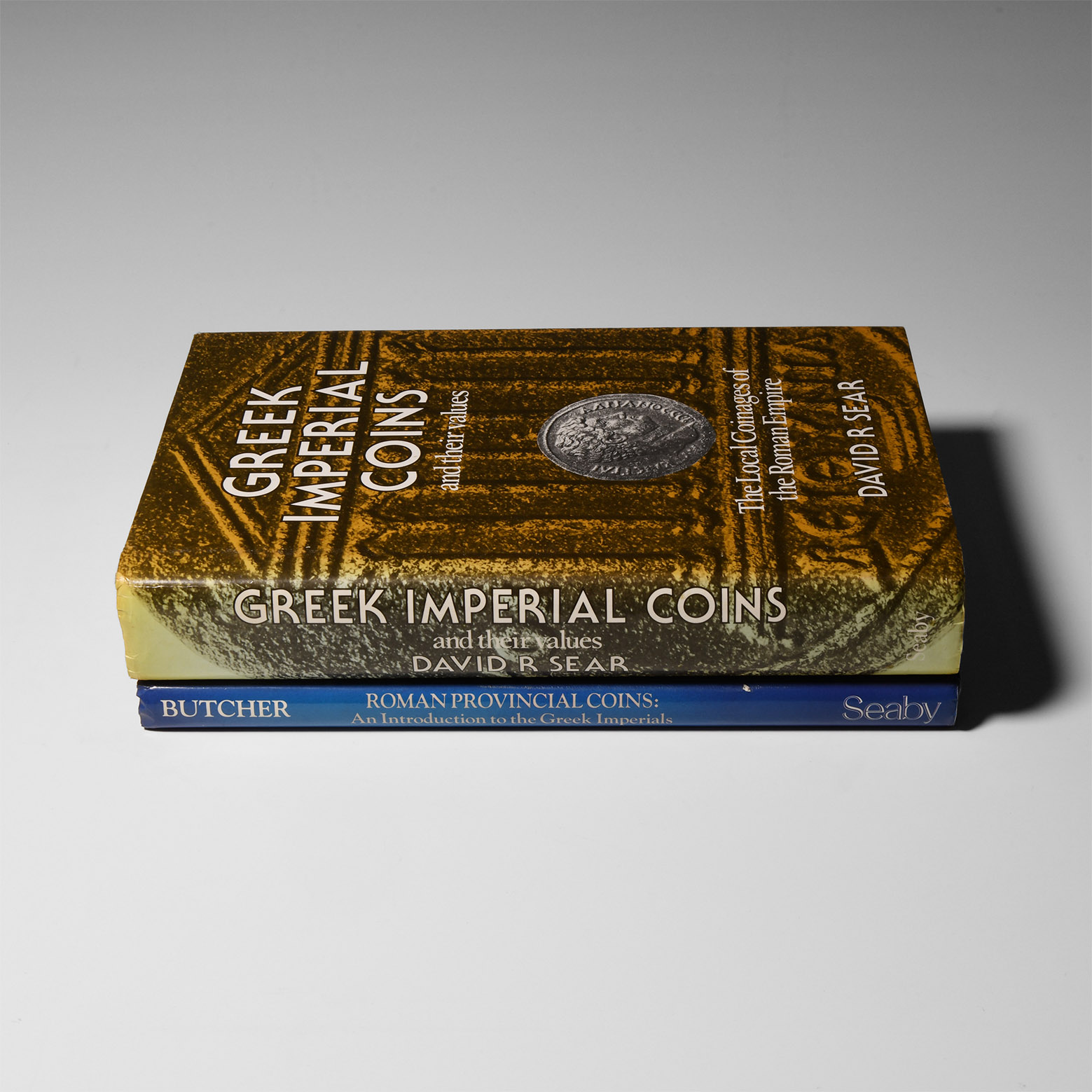K. Butcher Roman Provincial Coins: An Introduction to the Greek Imperials, hardback with dustwrapper, 138 pp, line drawings, monochrome photographs; D.R. Sear Greek Imperial Coins and their Values, hardback with dustwrapper, 636 pp, monochrome photographs. 1.46 kg total, 22.5 x 14.5 cm each