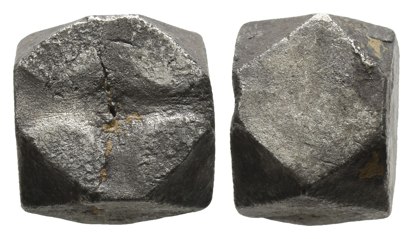 Polyhedral silver coin; one side with cross-like groove. 7.25gr, 10mm.