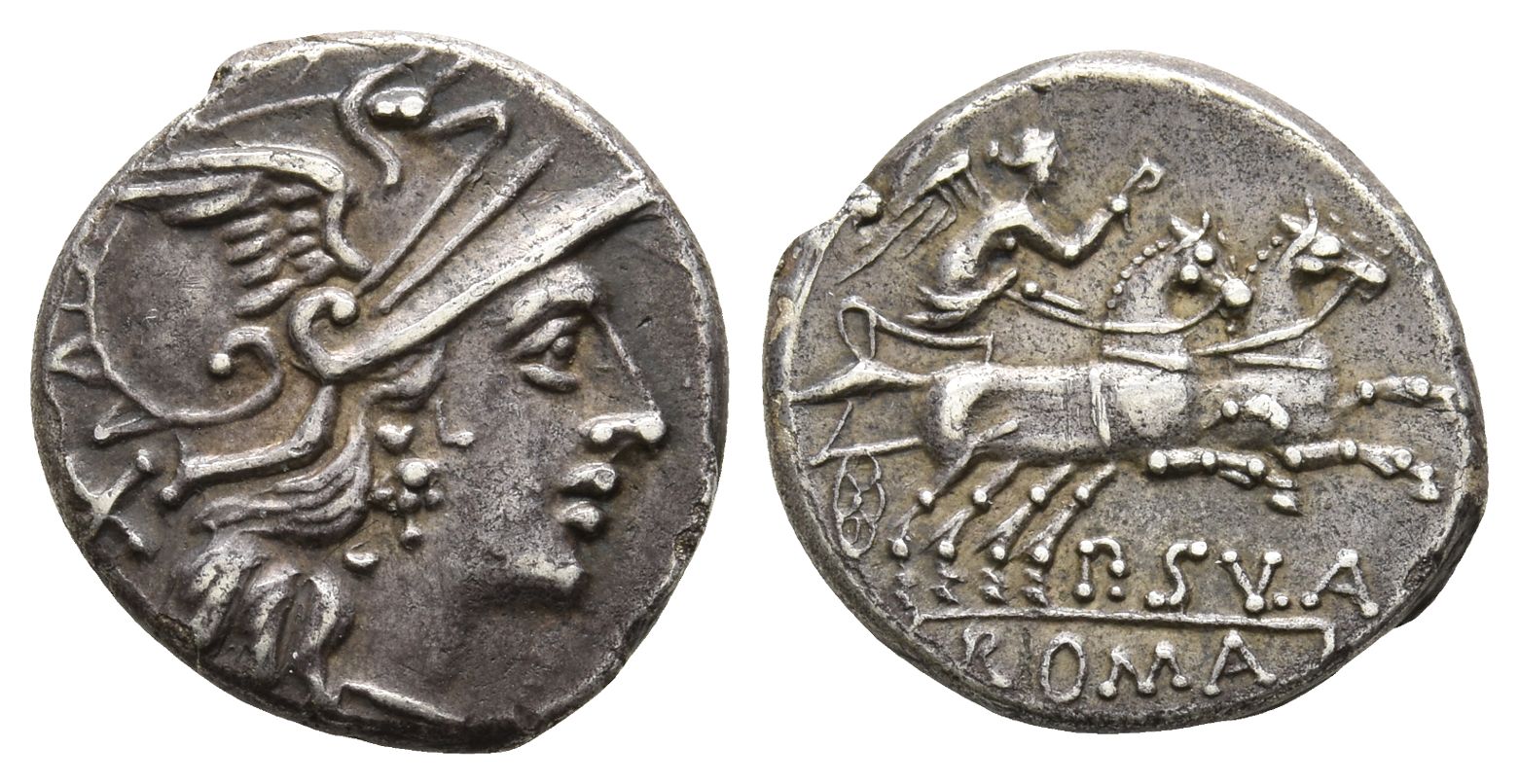 Helmeted head of Roma to right; X (mark of value) behind / Victory driving galloping biga to right, holding whip and reins; P • SVLA (partially ligate) below, ROMA in exergue. Crawford 205/1; BMCRR Rome 828; RSC Cornelia 1. 3.93gr, 18mm, 3h.